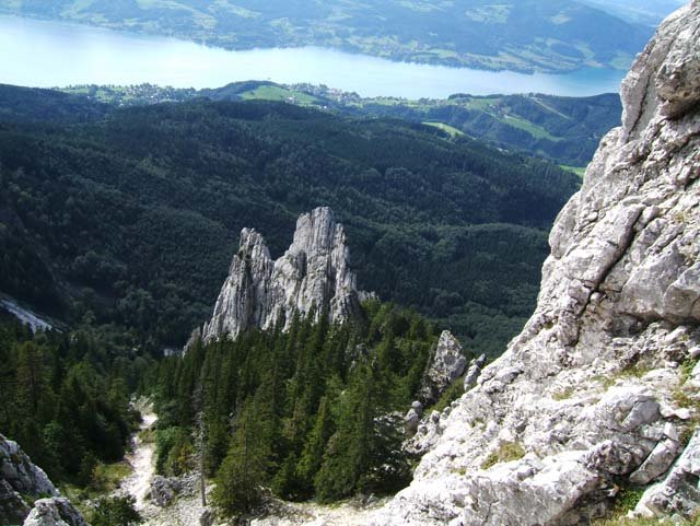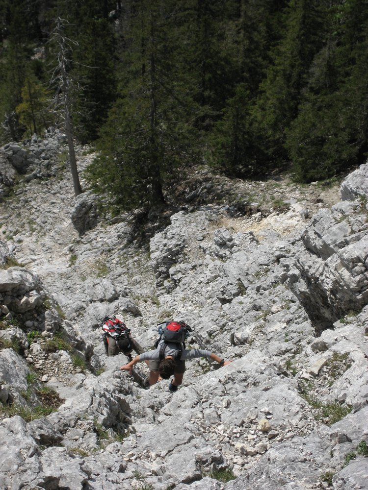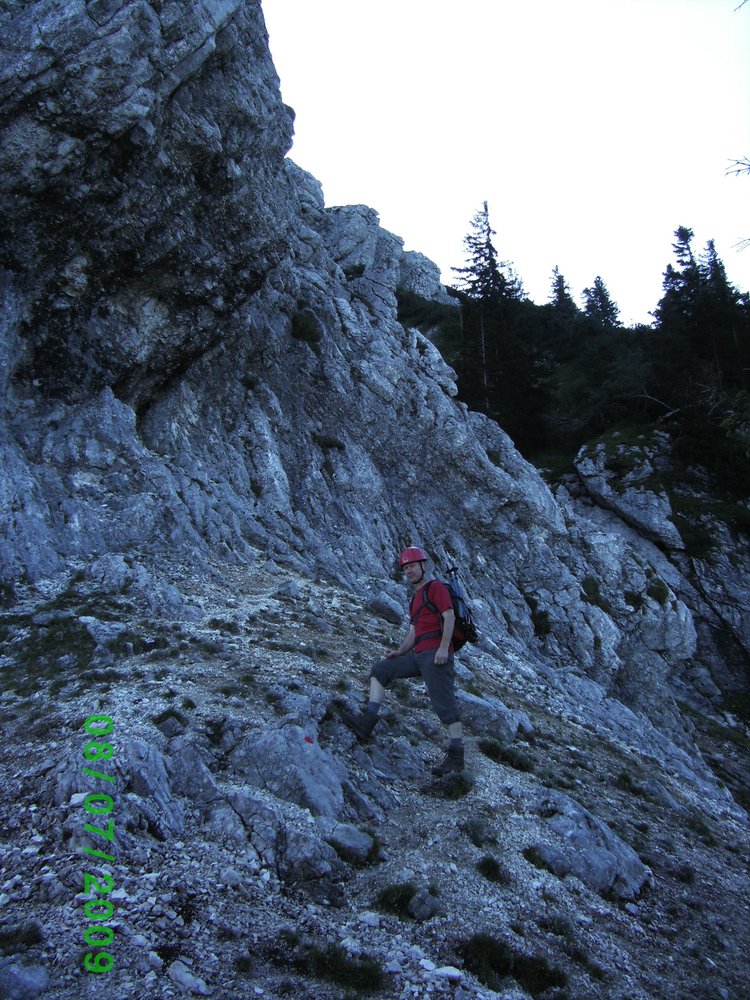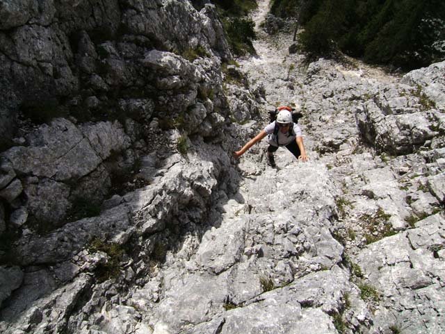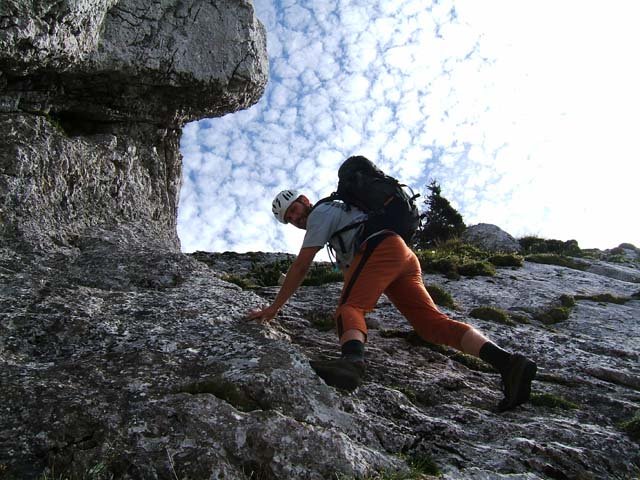 Sehr lohnender und direktester Anstieg auf das Höllengebirgs-Plateau im Bereich des Hochleckenhauses abseits markierter Wanderwege. Gehgelände und Kletterstellen bis 2 wechseln einander ab. Die Route ist teilweise mit rosa Punkten und Steinmännern markiert.