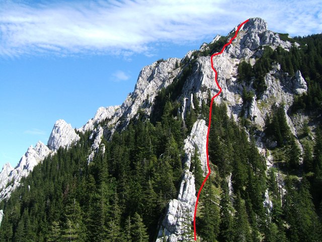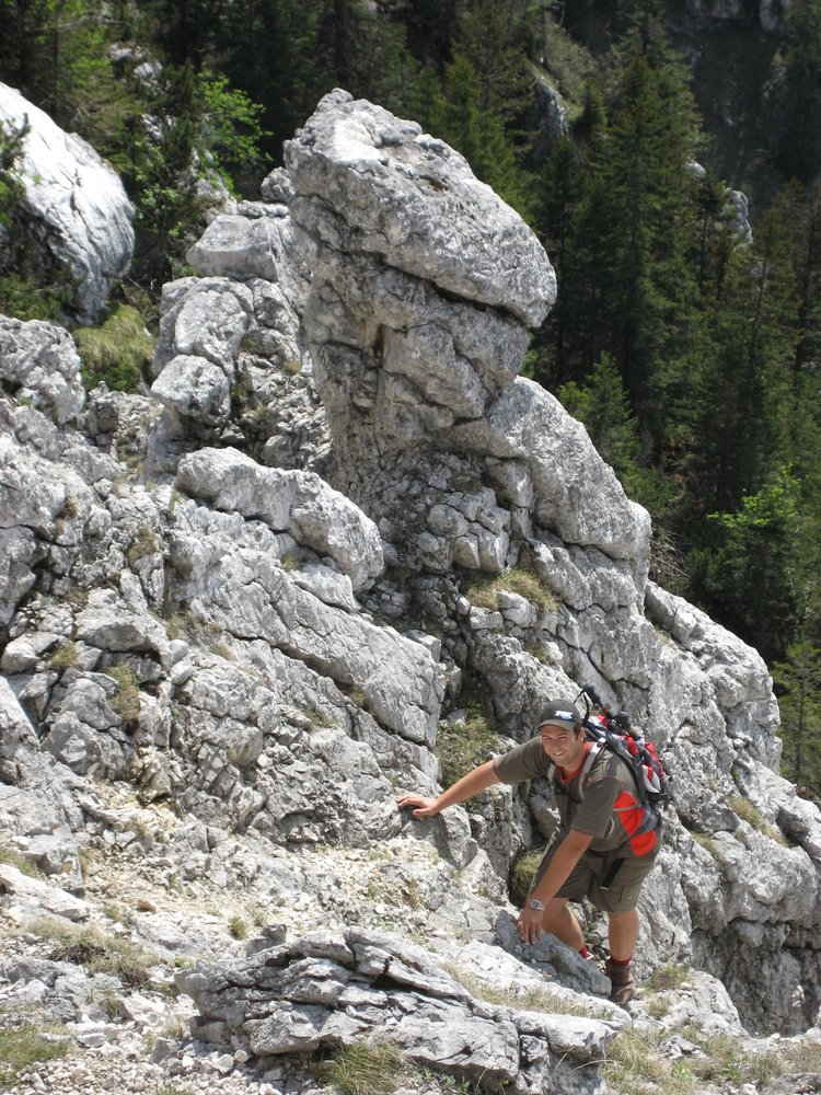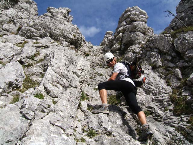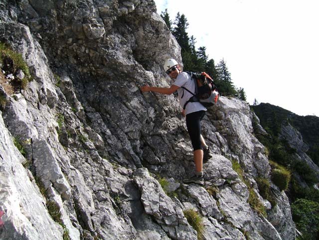 Nach dieser ersten schönen Kletterei kurz nach rechts ansteigen und dem Grat weiter folgen, bis man nach links abgedrängt wird, und zum nächsten Aufschwung gelangt. Hier nach links in eine Nische um eine Platte mit Querriss zu überklettern. Schließlich über einen grasdurchsetzten Fels am Grat entlang und dann nach links zum Gipfel mit Gipfelbuch!