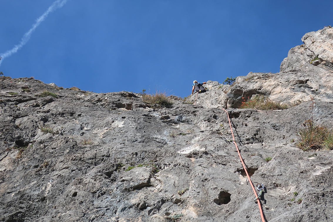 Die Route endet auf dem großen Band - entweder abseilen oder oben die Routen "Sunset Boulevard" (6/6+) oder "Im Auge des Geiers" (7-/7) weiter klettern.