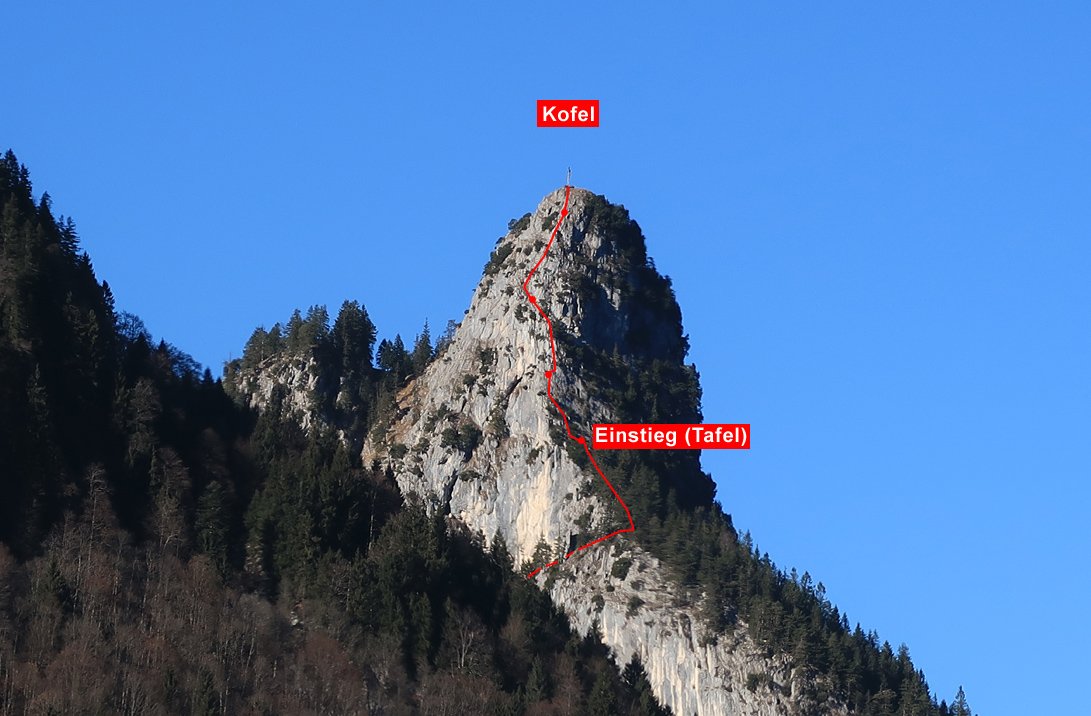 Vom Parkplatz zum Wanderweg hinter dem Friedhof und den Beschilderungen "Kofel" folgen. Auf dem Kofelsteig in Serpentinen aufwärts, man quert eine Schutthalde. Danach noch ein paar Kehren höher, bevor der Weg direkt an eine glatte Felswand kommt, verlässt man den Kofelsteig in einer Kehre auf Pfadspuren nach rechts. Man quert die Schutthalde und geht waagerecht zur Wand mit dem Schrofenvorbau. Über den Vorbau aufwärts (kurz II), dann rechts zum bewaldeten Grat. Auf dem Grat nach links in Richtung Gipfel (Pfadspuren), am Ende steiler über erdigen Fels (I) zwischen Latschen hindurch zum Einstieg (Bohrhaken, Tafel, unterhalb steht ein kleiner Laubbaum).