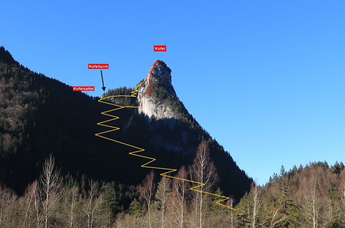 Vom Gipfel auf dem Kofelsteig zum Parkplatz beim Friedhof absteigen. Wer noch den Kofelturm besteigen will, folgt dem Abstiegssteig bis kurz vor den Kofelsattel (der Kofelsattel ist ein flacher Waldsattel deutlich unterhalb der letzten Seilsicherungen). Man geht weglos, nur leicht ansteigend in Richtung Nordwesten - oben im Wald sieht man Felsen - an deren Ausläufern steht der Kofelturm. Der Einstieg ist auf einem Flachstück bei einem kleinen Felsenfenster, welches von dem an die Wand angelehnten Turm gebildet wird.
