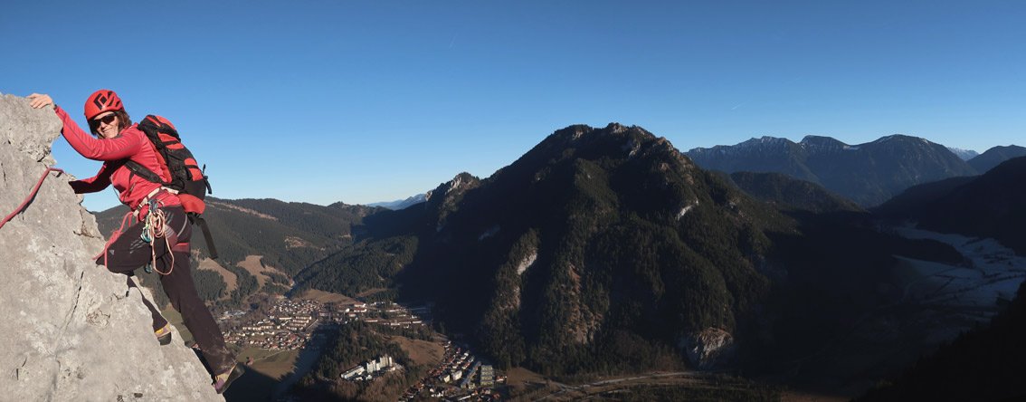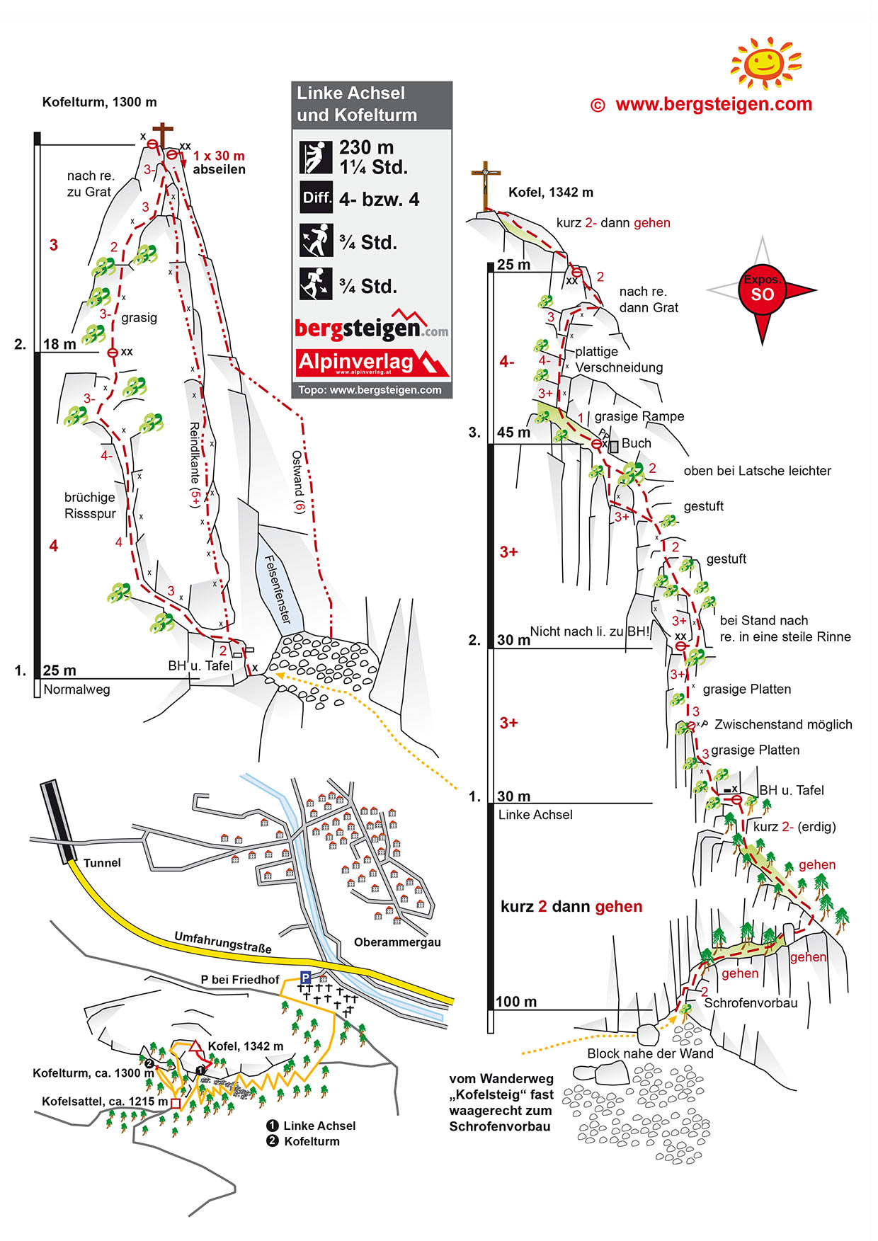 Nette, leichte und sehr beliebte Routenkombination am Hausberg von Oberammergau. Die Linke Achsel führt direkt auf den Gipfel des Kofel. Wer danach noch nicht ausgelastet ist, kann beim Abstieg noch den Kofelturm besteigen. Die Routen sind ideal für die Übergangszeit, wenn es trocken ist und kein Schnee liegt. Der einfache Zu- und Abstieg bzw. der schöne Rundumblick von der freistehenden Felsspitze des Kofels machen die Tour zur schönen, einfachen Nachmittagstour.