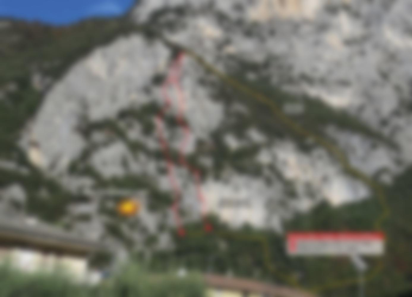 In Sarche vom Kreisverkehr bei der Kreuzung nach Madonne di Campiglio wenige Meter Richtung Madonna und dann rechts bei der Schule auf einer Straße hinauf (dort kann man auch parken) und den Schildern Via ferrata Rino Pisetta ganz kurz folgen bis man den waagrechten Weg am Waldrand erreicht. Auf diesem nach links unter die Wand und auf Steigspuren über Schotter aufwerts. Die Spuren führen nach links zur Wand, wo ein kurzer Klettersteig zum Klettergarten führt. Der Einstieg ist ca. 25 Meter links davon auf einem etwas höher (2 Meter hinaufklettern) gelegenen Absatz.