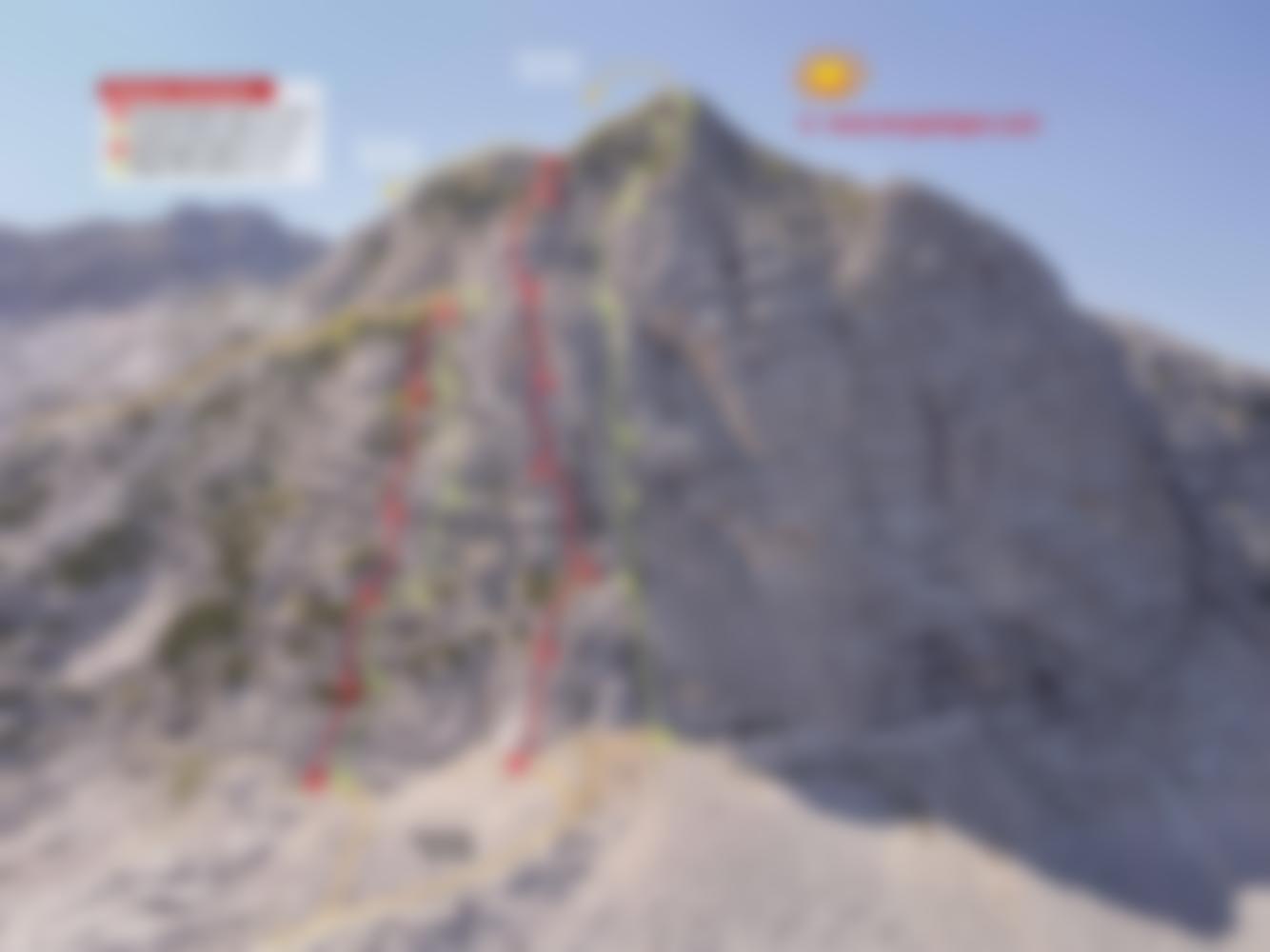 Sanierte Mehrseillängenroute. Absolut lohnende Riss- und Plattenkletterei. Die Route verläuft absolut logisch entlang der Risssysteme, vorbei an einem weißen Fleck und oben durch einen breiten Trichter. Die Schlüsselstelle (7-) in der Mitte erfordert Technik und Fingerkraft. Auch die Verschneidung (6-) sollte (vor allem bei Nässe) nicht unterschätzt werden. Das Platzieren von Friends macht die Route sicherer und rundet die Tour zu einer alpinen Mehrseillänge ab. Sie endet auf dem Niederen Grünberg (2174m), der durch leichtes, felsdurchsetztes Gehgelände erreicht werden kann. Vorsicht zwecks Steinschlag im oberen Wandbereich wegen nachkommenden Seilschaften und beim Abseilen! Helm! Nach Regenphasen etwas warten, bis die Route trocken ist (Wasserflecken kleiner werden).
