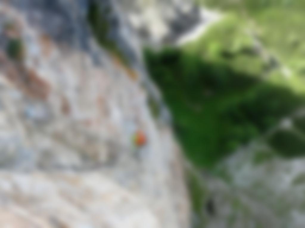 Dann gibt es zwei Möglichkeiten. Die linke (Flucht-)Variante führt in die linke graue Wand und endet ca. 10 m neben dem 4. Stand von der Nachbarroute, welche man über ein kleines Band erreichen kann. Die rechte ist die original Führe und leitet zu 2 weiteren Seillängen. Bei beiden startet man links vom Stand weg und ca. 10 m bis zum ersten BH.