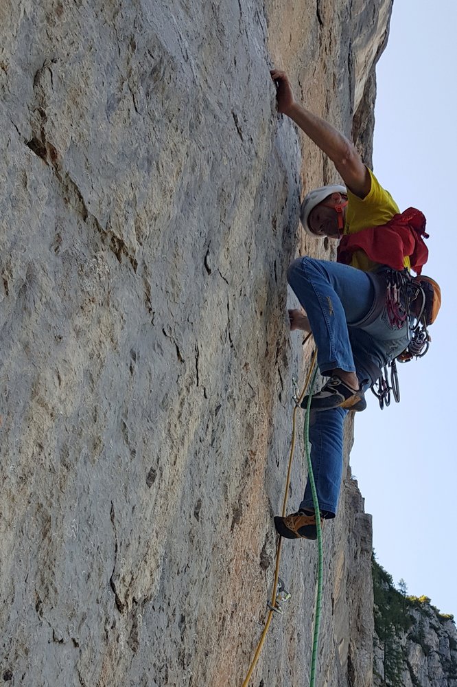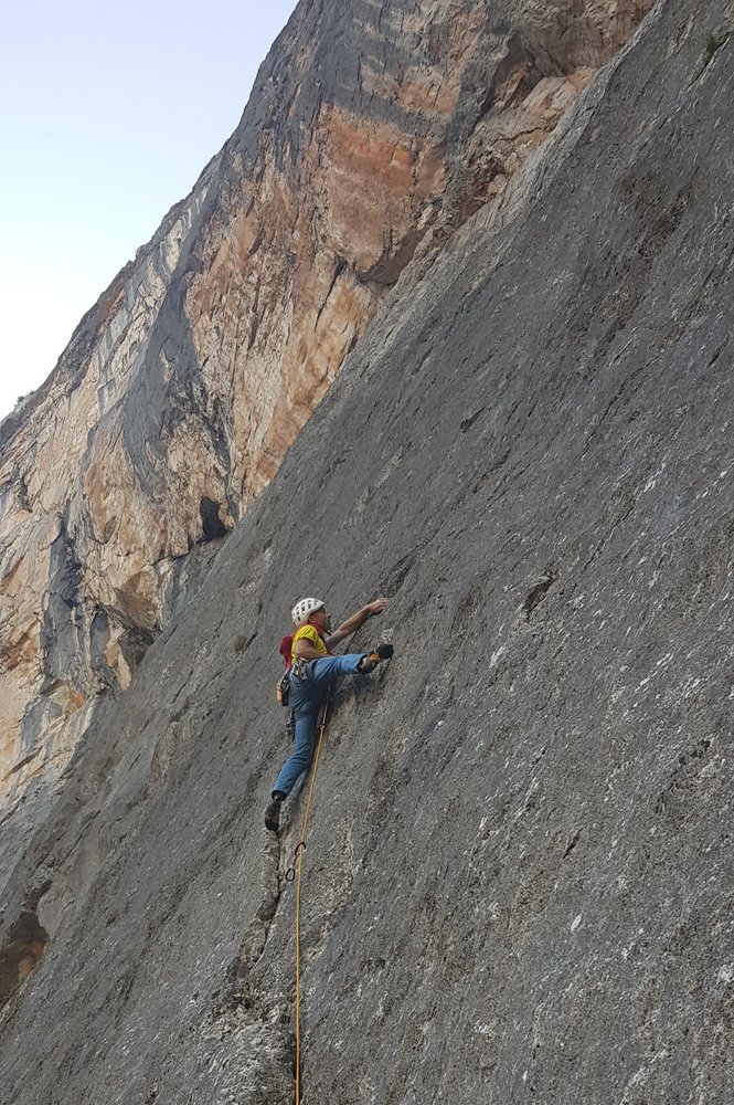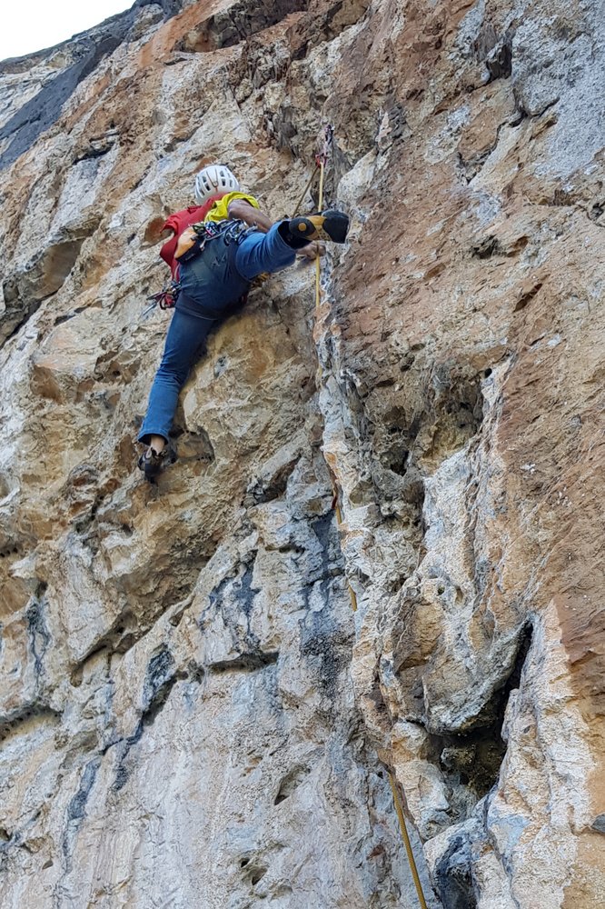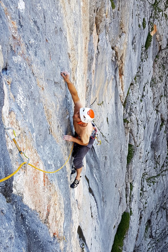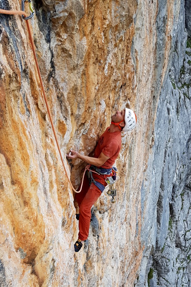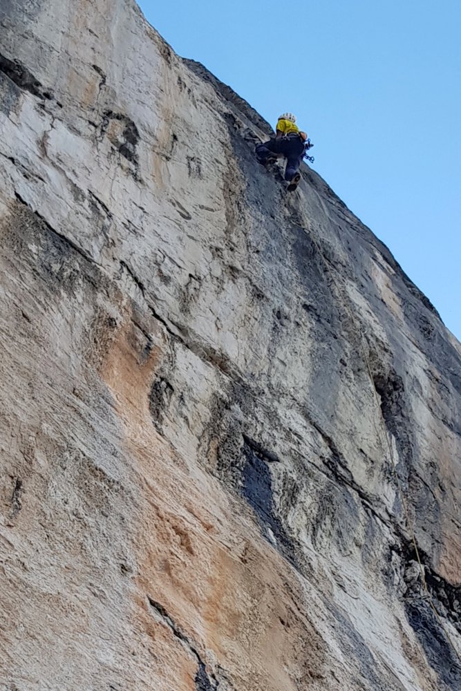 An scharfen Leisten in hellem, gelblichem Fels senkrecht bis zur stark überhängenden Wand.