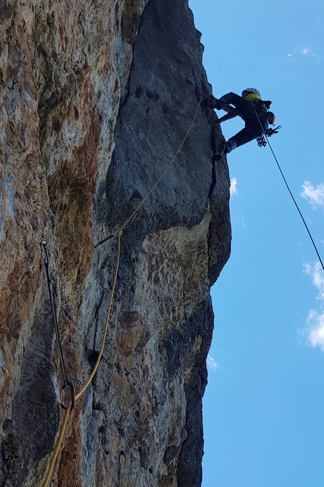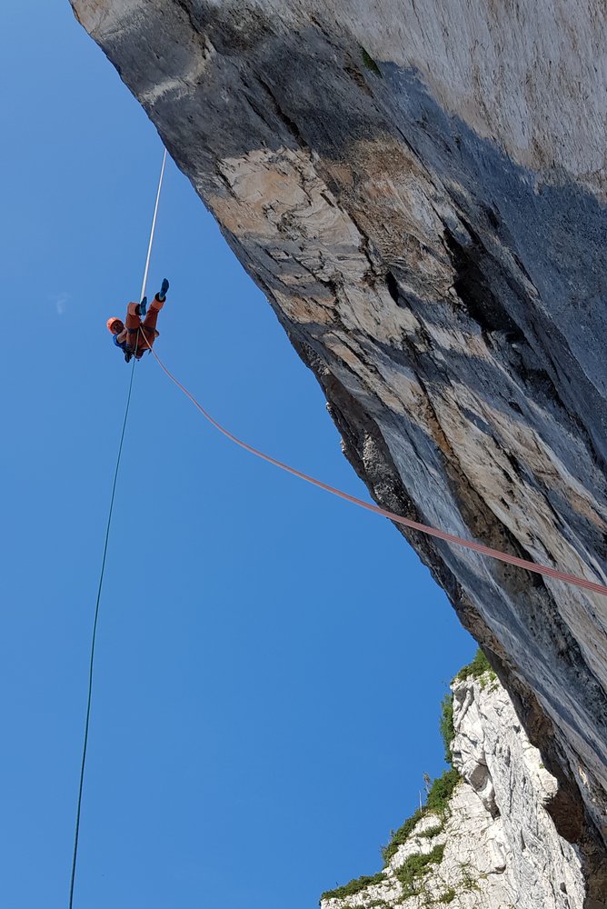Am Besten über die Route abseilen (Achtung: Kontakt zum Fels nicht verlieren!)