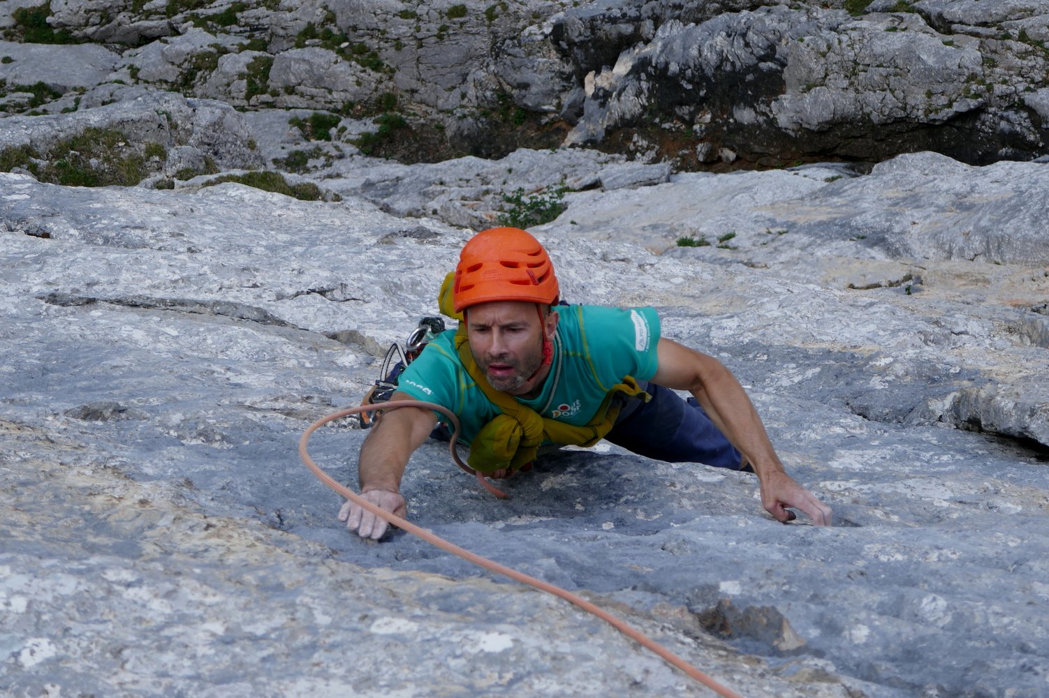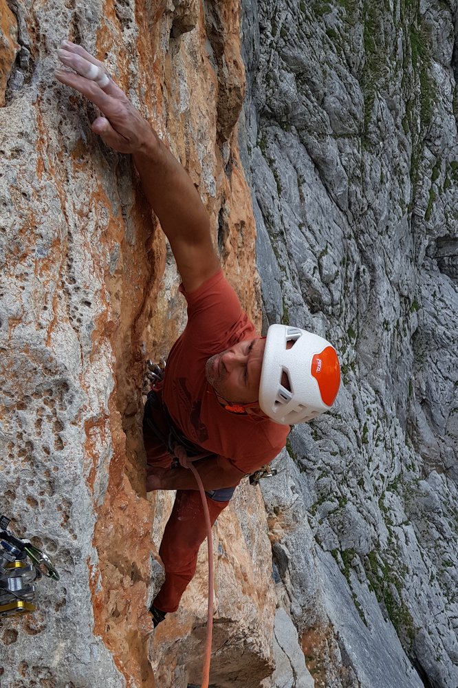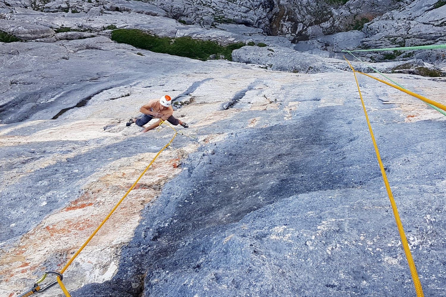 Weiter geht es in grauem Fels und steiler Wandkletterei zu einem Grasband, das sich für eine Mittagspause anbietet.