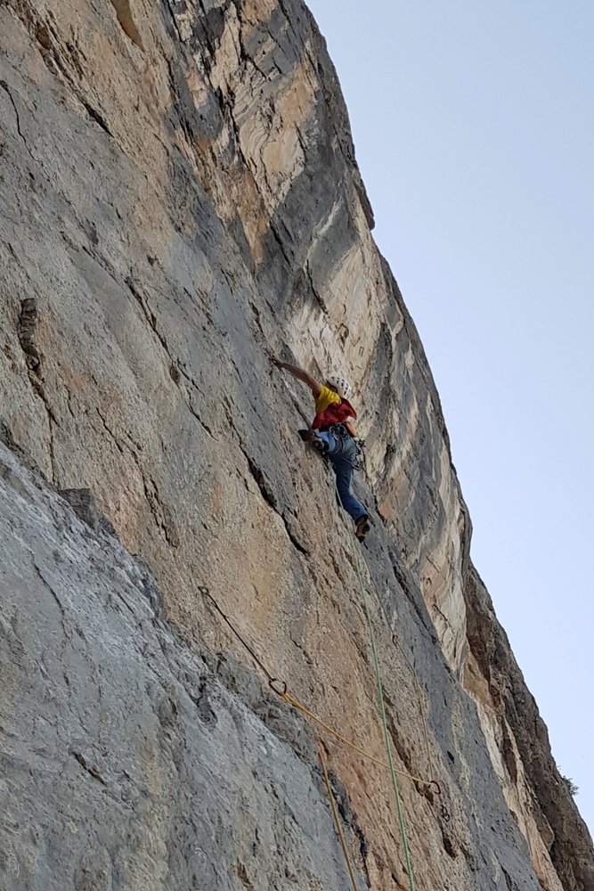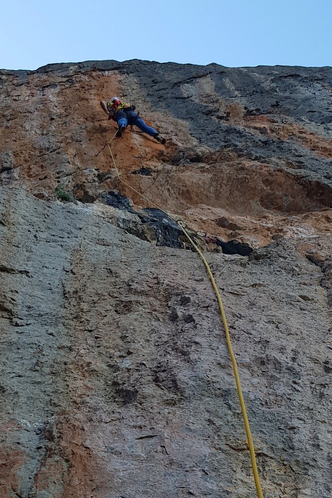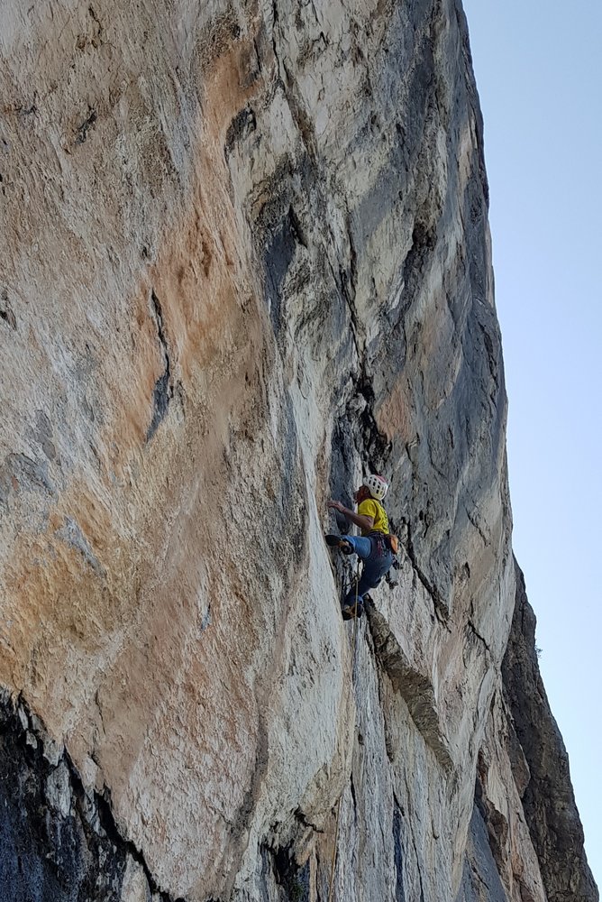 Die Route begeistert durch die sehr abwechslungsreiche Kletterei in unterschiedlichen Felsfarben und Griffformationen in super kompaktem und meist überhängendem Fels.