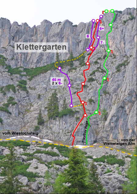 Über eine Forststraße von der B 178 aus zur Wemeteigen Alm (kann abgekürzt werden, Schilder beachten) und weiter zu den Platten hinter der Alm (Beschilderung Almplatte). An der Wand dann nach links zum Einstieg oberhalb eines Schuttfeldes queren. Siehe Übersichtsbild.