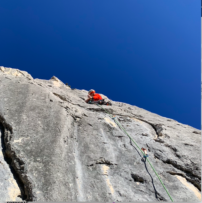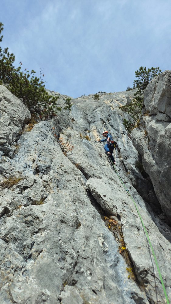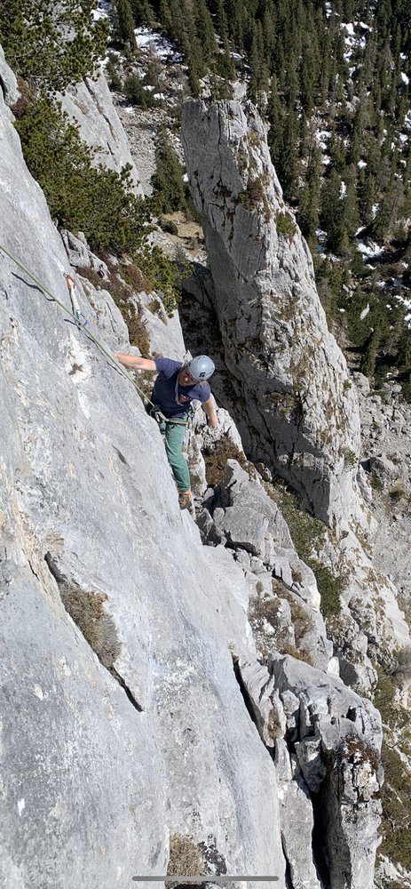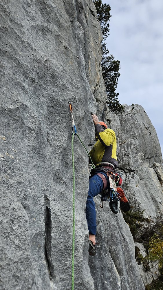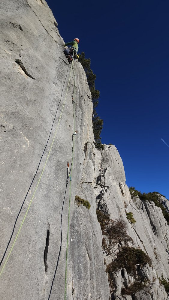 Lohnende Alpine Sportkletterroute mit richtig schönen und originellen Seillängen. Die Felsqualität ist gut, aber im Mittelteil sind auch Schroffen vorhanden. Im oberen Teil ist der Fels ein Traum, Steinplatte halt.