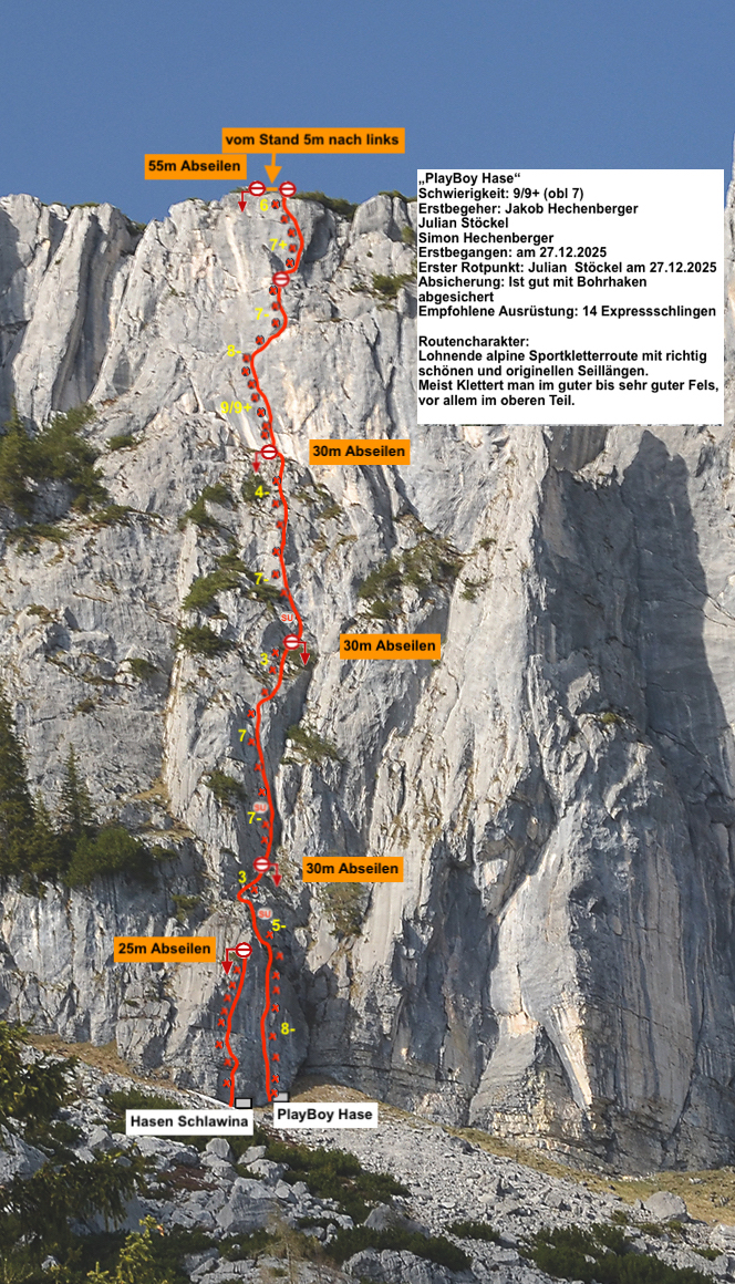 Abseilen: Beim letzten Stand 5 m links ums Eck zur Nachbarroute. Da in eine Verschneidung abseilen Man kommt dann direkt zu 4. Stand (55–60 m). Weiter über die Route abseilen.