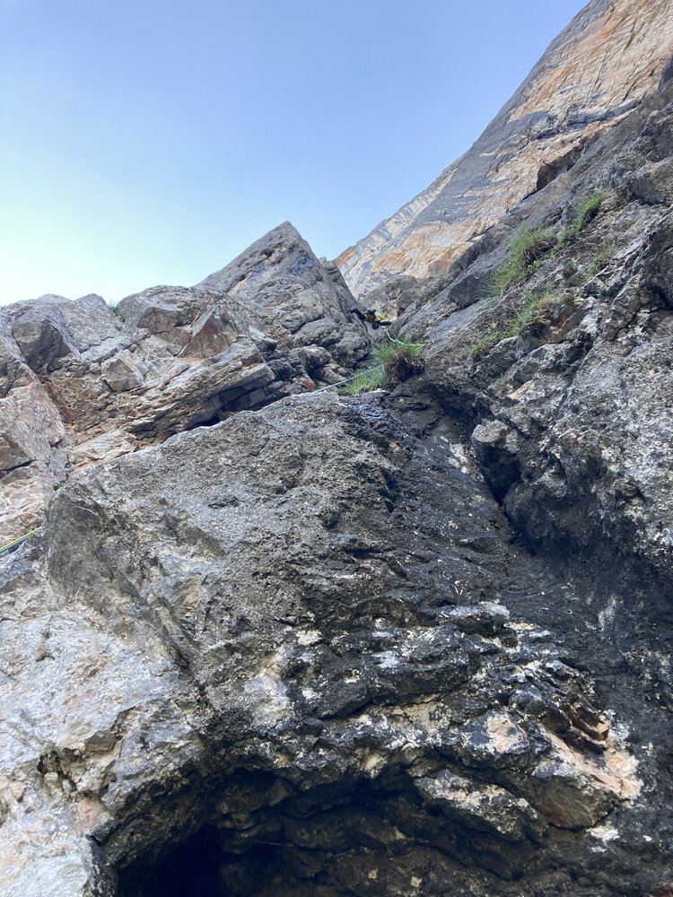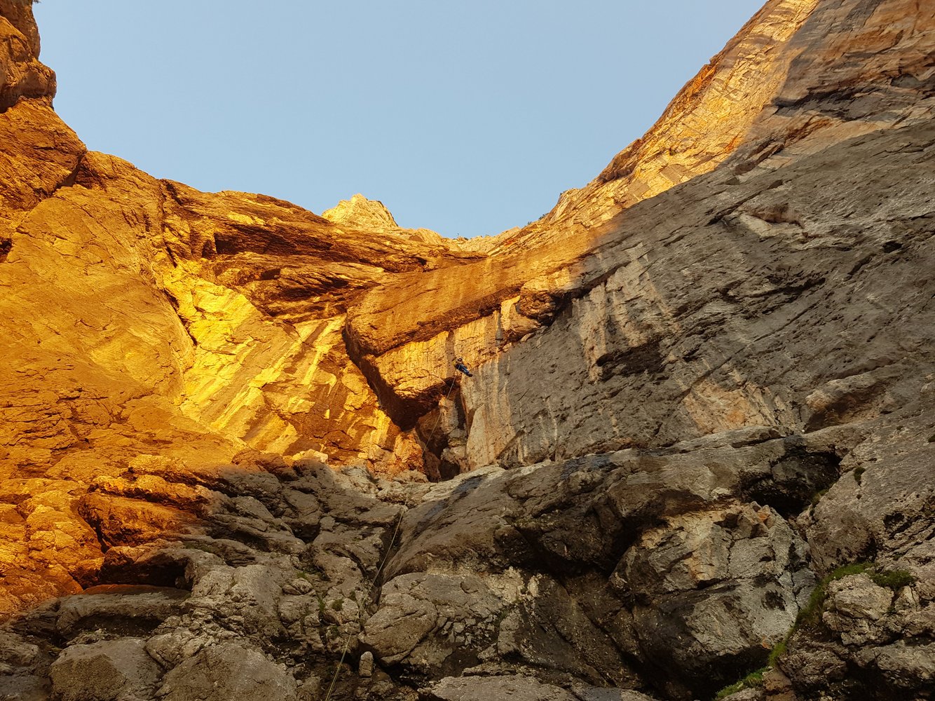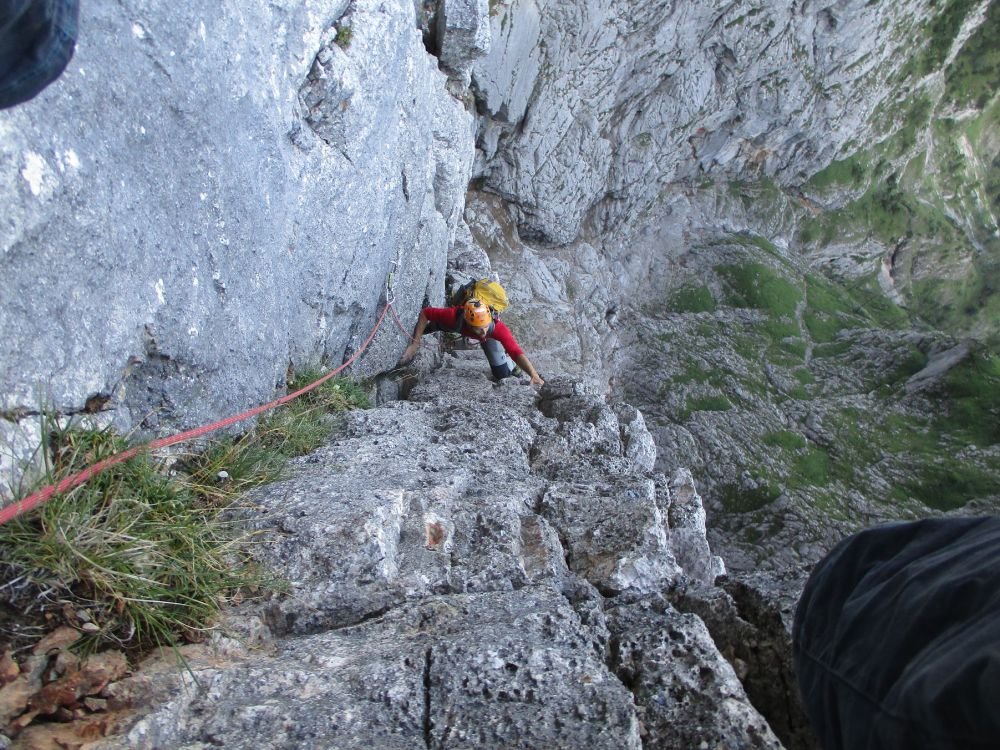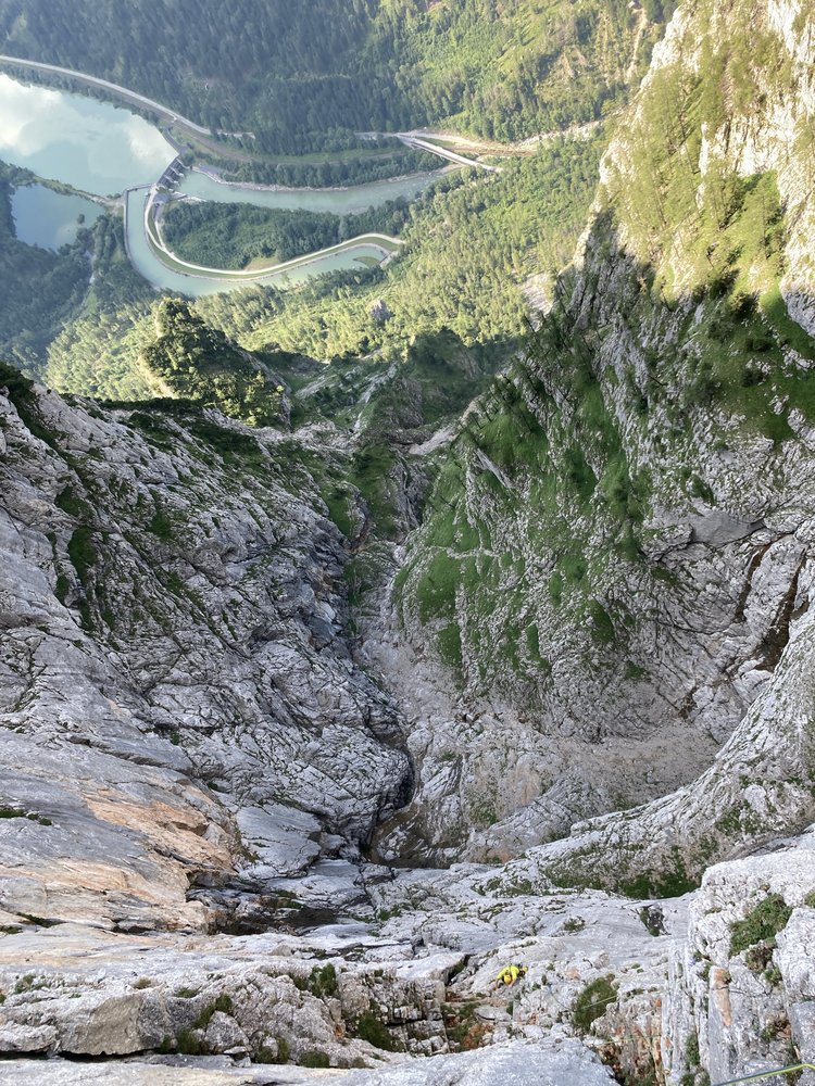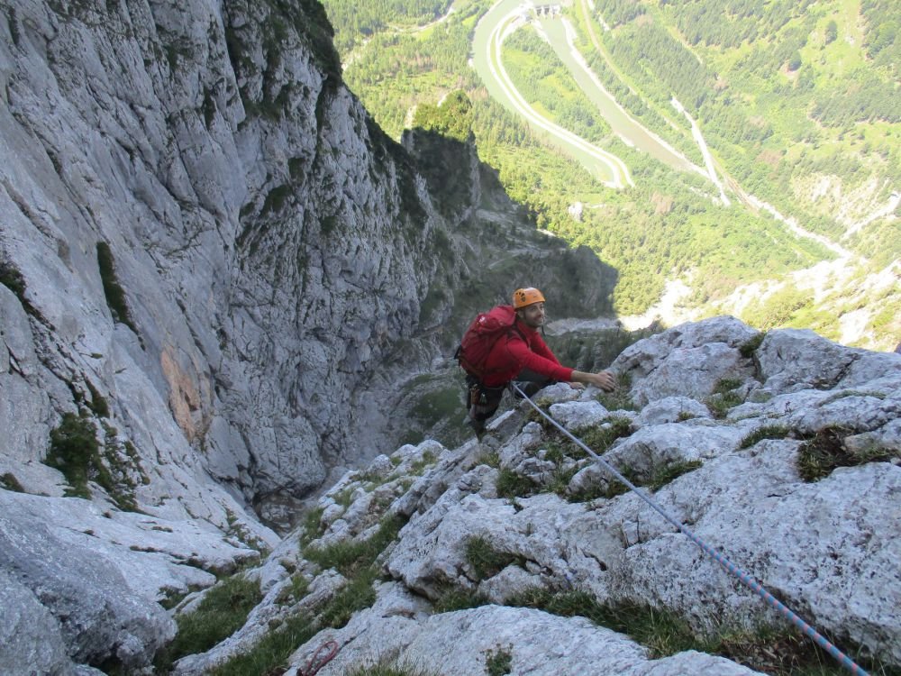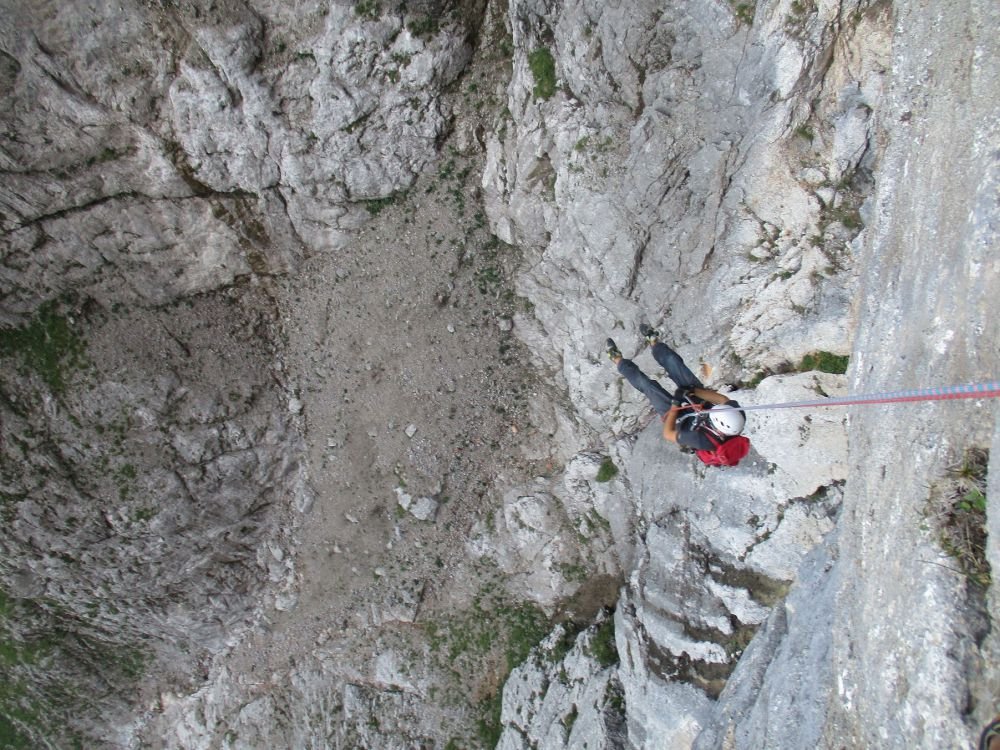 Abseilen zuerst entlang der Route und dann gerade hinunter über die brutal luftige Abseilpiste zurück ins Leben. Danach wie Zustieg.
