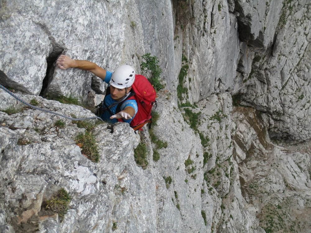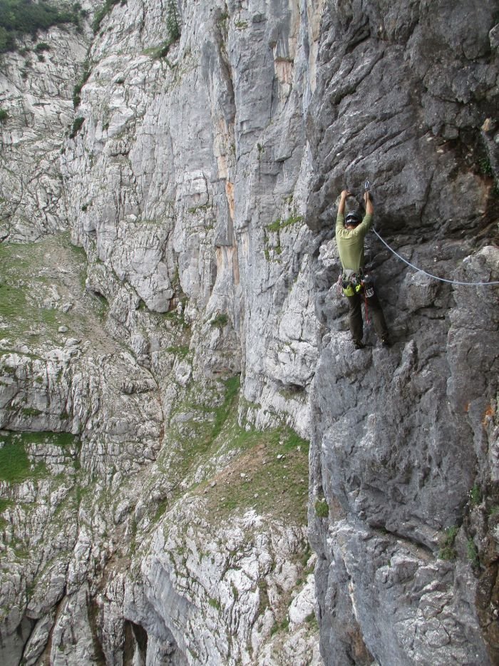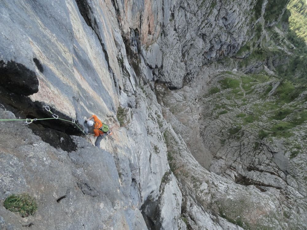 Gut mit BH gesichert, nur im 5ten Grad muss man schon etwas vom Haken wegklettern. Im leichten Gelände nur Orientierungshaken. Absicherung teilweise mit Camalots verbesserbar. Alle Abseilstände eingerichtet.