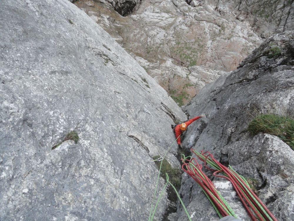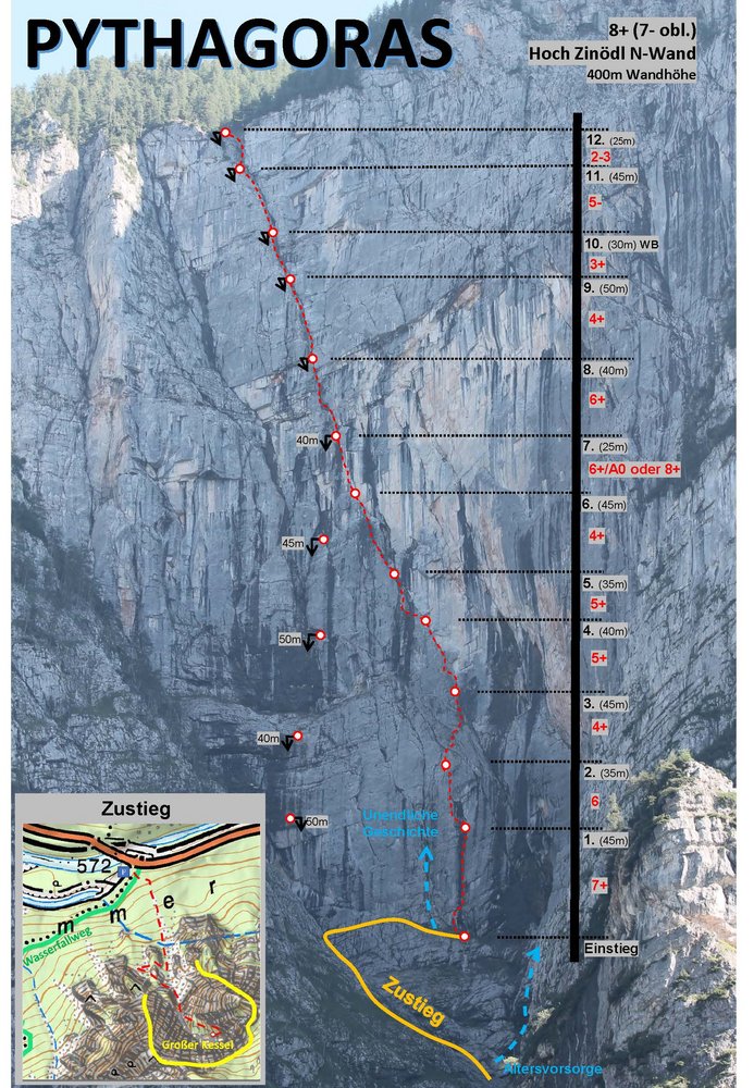 - Trockene Verhältnisse abwarten! - Nicht von der ersten, anspruchsvollen Seillänge abschrecken lassen! - Rückzug über den unteren Teil der Tour möglich, aber unangenehm. Einen ausführlichen Bericht und weitere Bilder findet man auf folgender Seite: cormario.wordpress.com/2018/02/21/pythagoras-hochzinoedl/