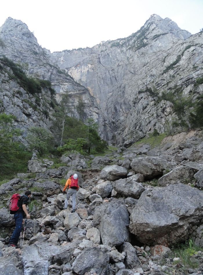 Vom Parkplatz „Kummerbrücke“ nicht dem rot-weiß-roten Pfeil nach rechts zum Wasserfallweg folgen, sondern dem kleinen Steig geradeaus in den Wald. Nach dem kurzen Waldstück ist ein schwer erkennbarer Steig mit Steinmännern markiert. Diesen verlässt man bald nach links hinauf zum Schotterfeld, in Falllinie der Zinödlwand. Diesem folgt man bis die rechte Grabenflanke orangesandig wird und zweigt dort bei einem Steinmann rechts auf den grünen Gamssattel ab. Von diesem führt der Gamssteig waagrecht nach rechts und dann hinauf zu den Felswänden, dort quert er dann nach links in den großen Kessel. Weiter den wenigen Steinmännern folgen und von links über das Band zum Einstieg queren. Zustieg bei Nässe allgemein heikel.