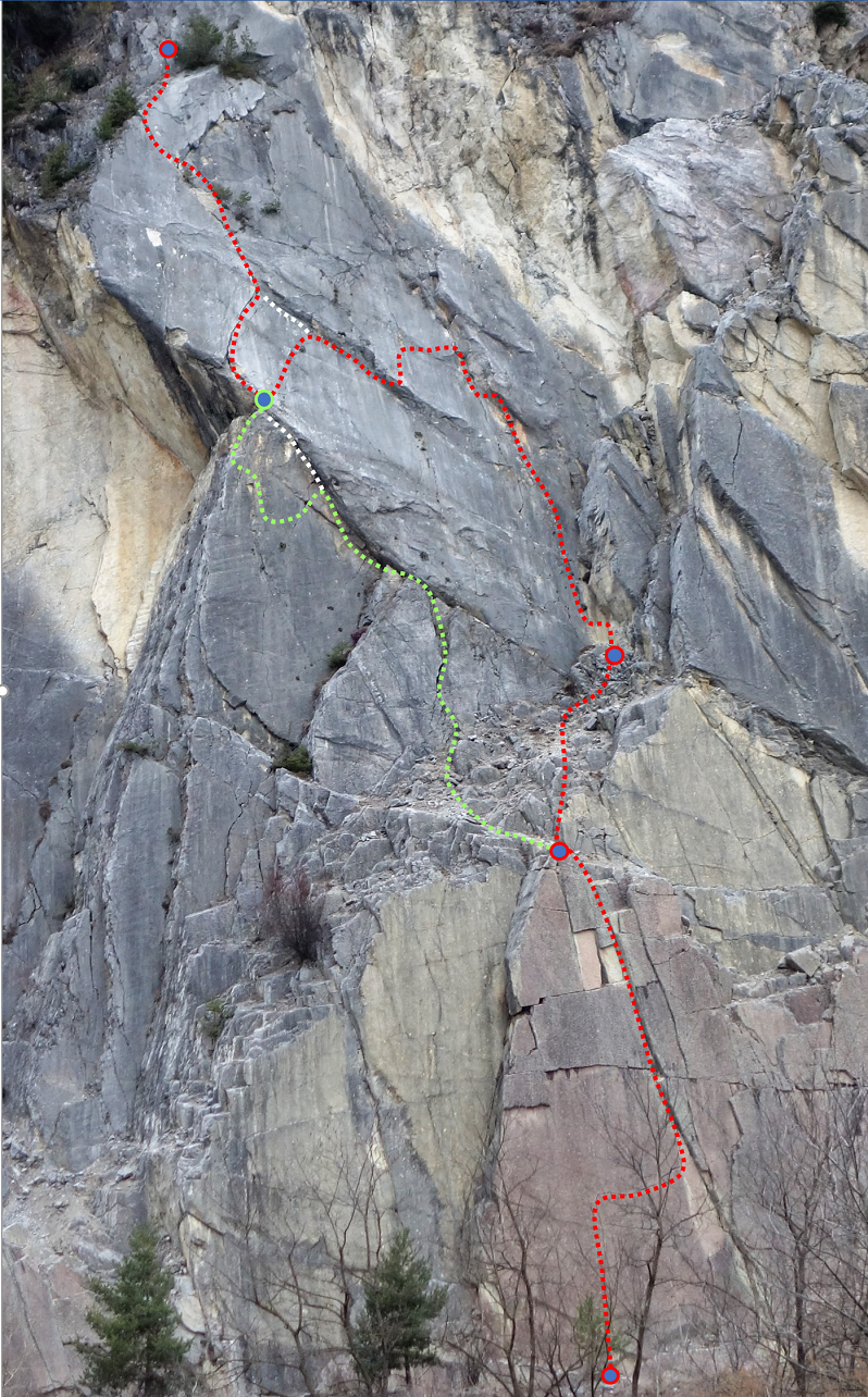 Zuerst leichte, aber brüchige Kletterei, in der Platte dann delikate Bewegungen über gute Sicherungspunkte an nicht immer ganz festem Fels.