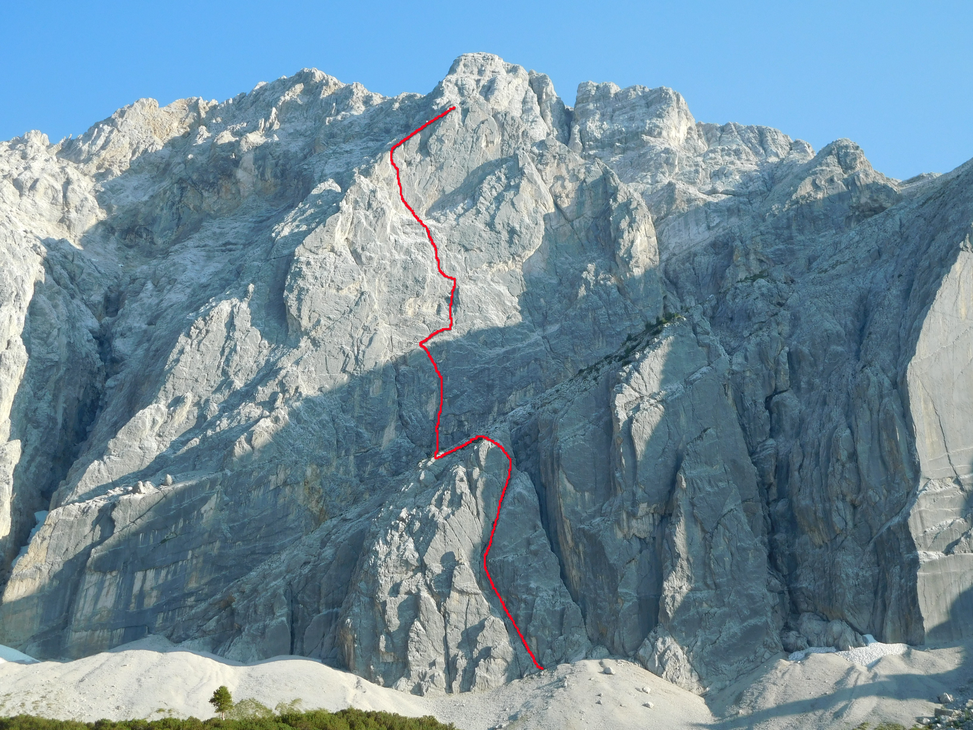 Von dort seilfrei hinauf zum Pfeilerkopf (III). Von dort quert man über Bänder westlich hinaus zum Steig, der auf die Speckkarspitze führt und über diesen zurück zum Haller Anger.