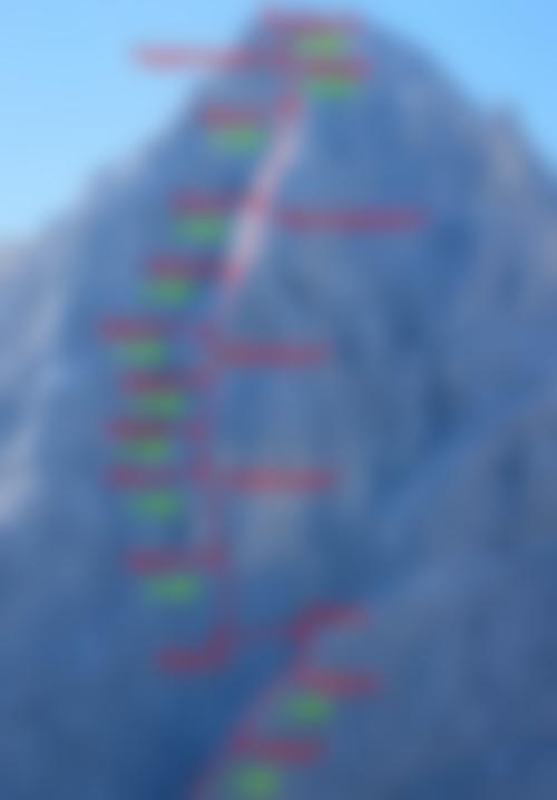 "Schrei aus Stein“; Kletterlänge vom Wandfuß ca. 650 Meter bis zum Ausstieg; 750 bis zum Gipfel; Schwierigkeitsvorschlag 9-/9 im Rotpunktdurchstieg (8- obl.). Rest siehe Topo.