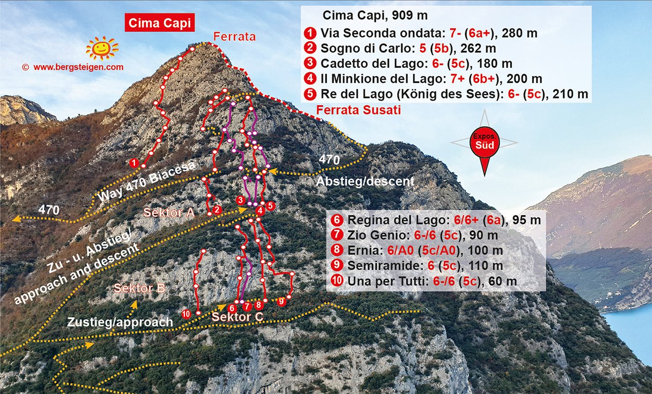Die Seconda ondata ist eine von den Erstbegehern wirklich gut gefundene Linie an der Südwestseite der Cima Capi. Die Route verläuft über Platten, Plattenrampen und im oberen Teil an steilen, teilweise plattigen Aufschwüngen bis fast hinauf zur Ferrata Susatti. Gesamt ein schönes, längeres Kletterabenteuer mit abwechslungsreicher Kletterei und perfektem Blick auf den Gardasee!