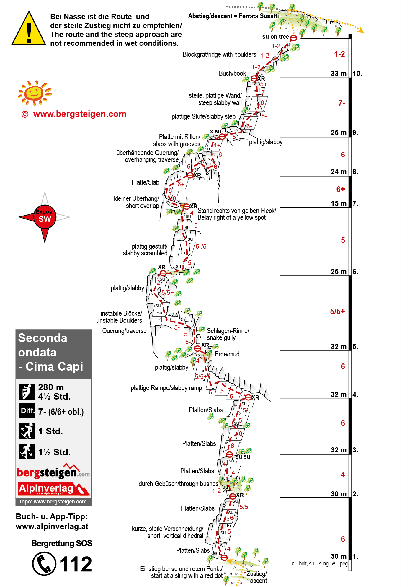 Bei Nässe sind sowohl der steile Zustieg, als auch die Klettertour nicht zu empfehlen.