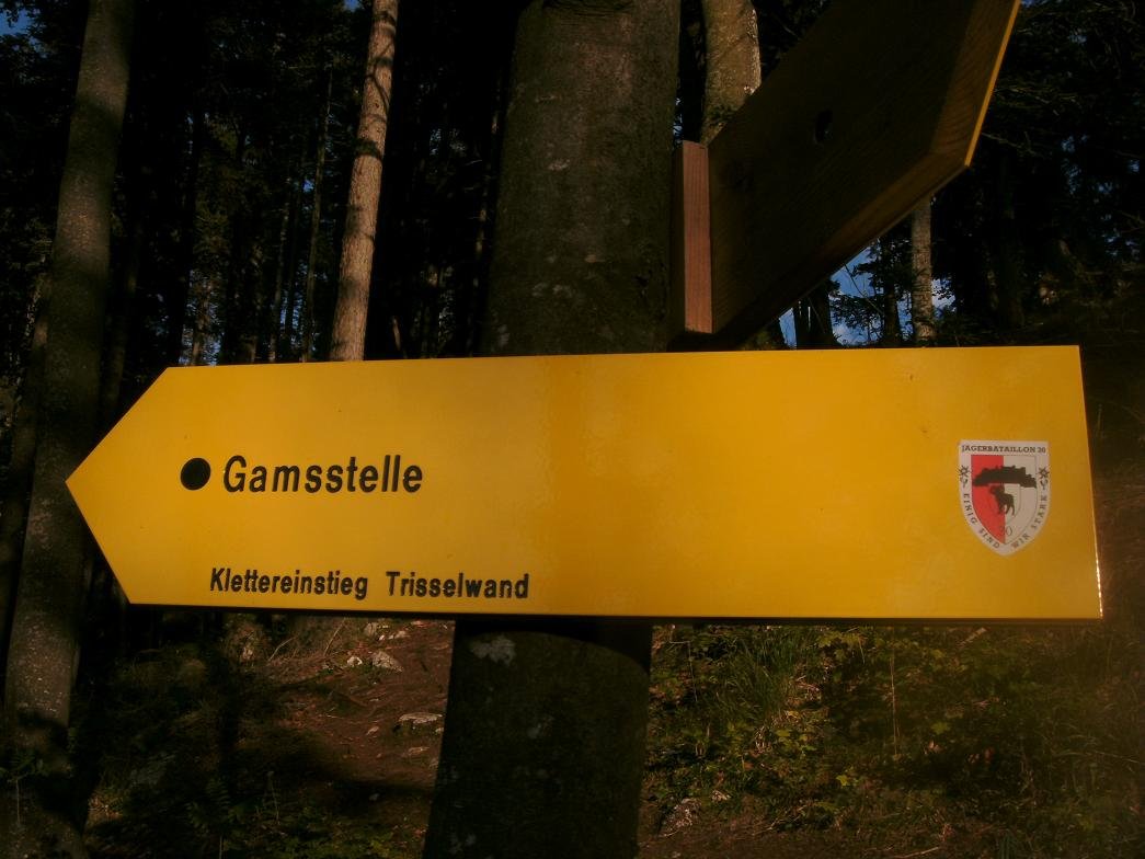 Beim Gasthof beginnt der markierte Wanderweg Richtung „Trisselberg“. Diesen über die Wiese aufwärts bis zum Zaun. Dort horizontal nach links in den Wald Richtung „Gamsstelle, Trisselberg“. Beim nächsten Wegweiser die Markierung nach links verlassen und Richtung „Gamsstelle – Klettereinstieg Trisselwand“ weiter. Dieser Weg quert den Hang nach links, zuerst horizontal, dann ansteigend bis zu einem ebenen Platz in der Latschenzone („Hohe Gamsstelle“, Hubschrauberlandeplatz). Den Weg weiter kurz bergab (ca. 50 Längsmeter) und dann nach rechts durch Latschengassen und Schrofen z.T. steil bergauf bis zu einer Höhle mit Bäumen. Dort anseilen.