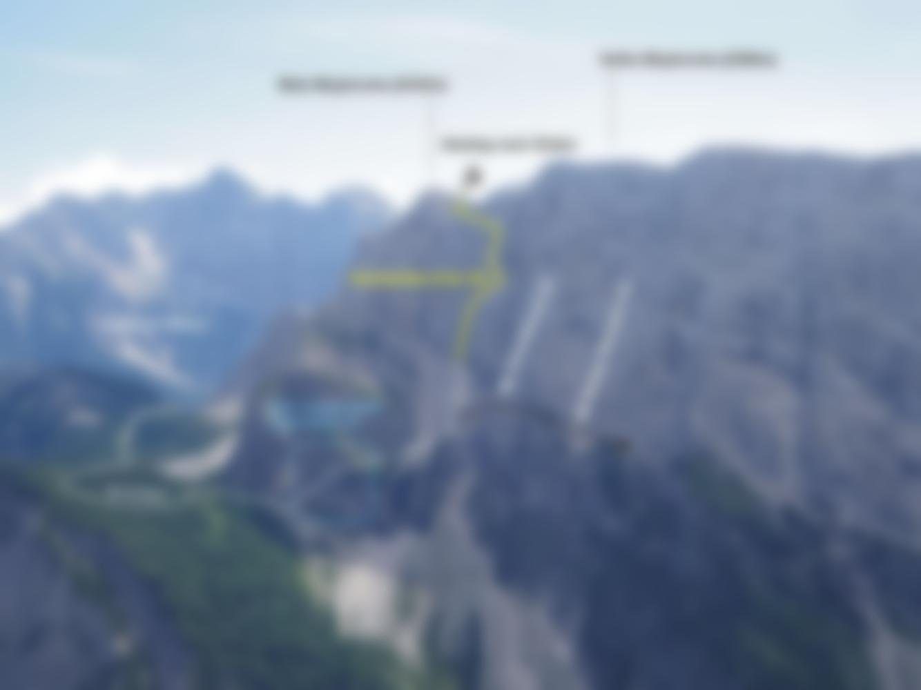 Vom Gipfel der Großen Mojstrovka (Velika Mojstrovka, 2366m) in nordöstlicher Richtung entlang des Grats. Steinmänner führen dann kurz hinab, ein großer Steinmann markiert den Einstieg durch eine kleine Wand ins Kar zwischen Großer und Kleiner Mojstrovka. So gelangt man auf den Normalweg, der von der Kleinen Mojstrovka zum Vrsic-Pass zurückführt. Dieser ist teils Seilversichert, aber problemlos zu machen.