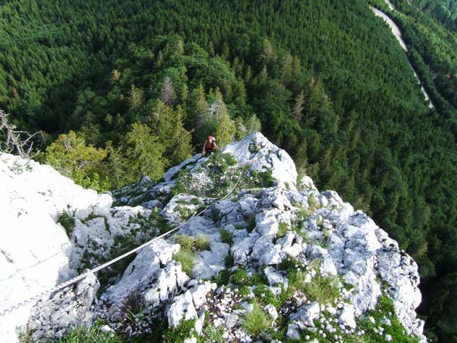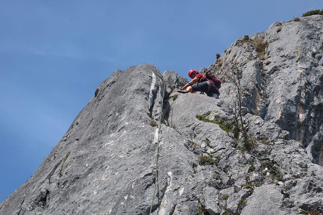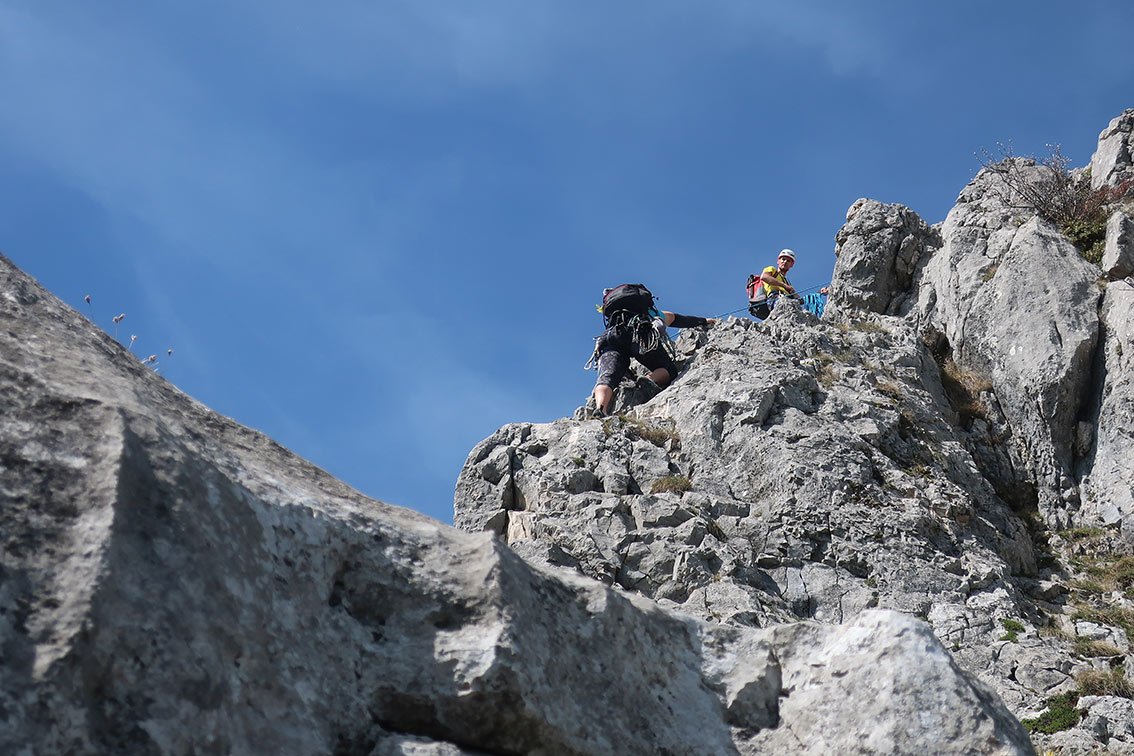 5. SL: Vom Stand gerade hinauf auf eine Rampe, dann zur nächsten Stufe und rechts der Bohrhaken hinauf. Am Ende über steilen, gestufen Grat zum Kettenstandplatz.