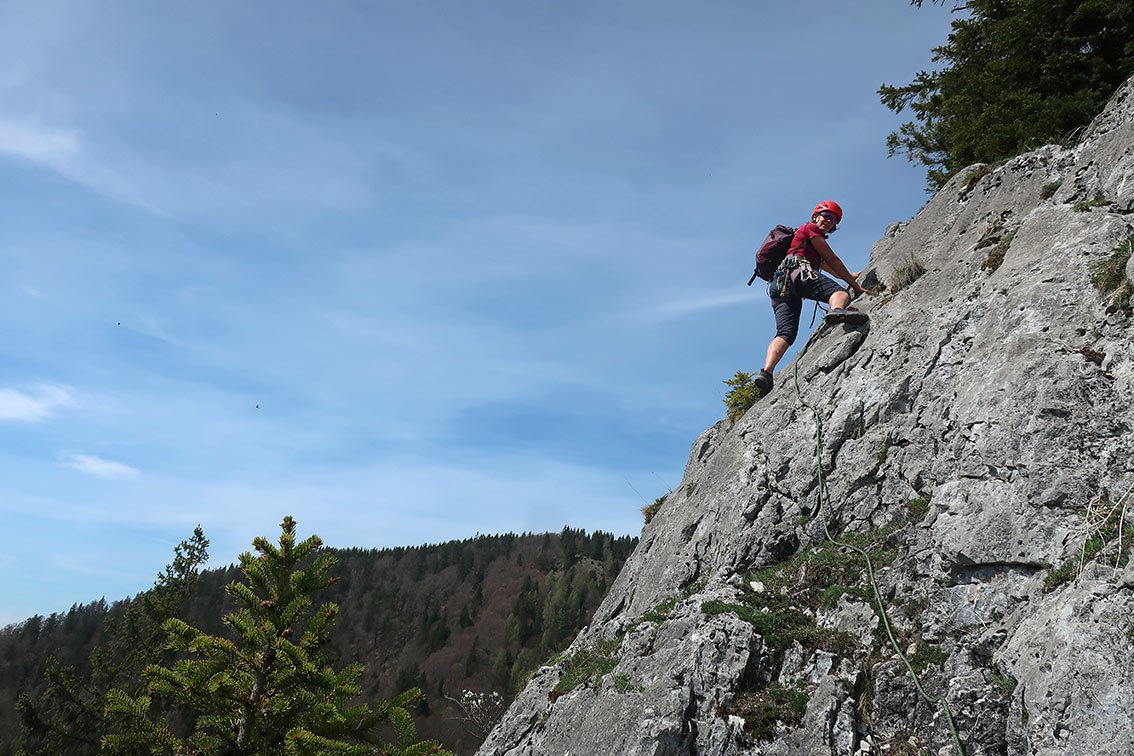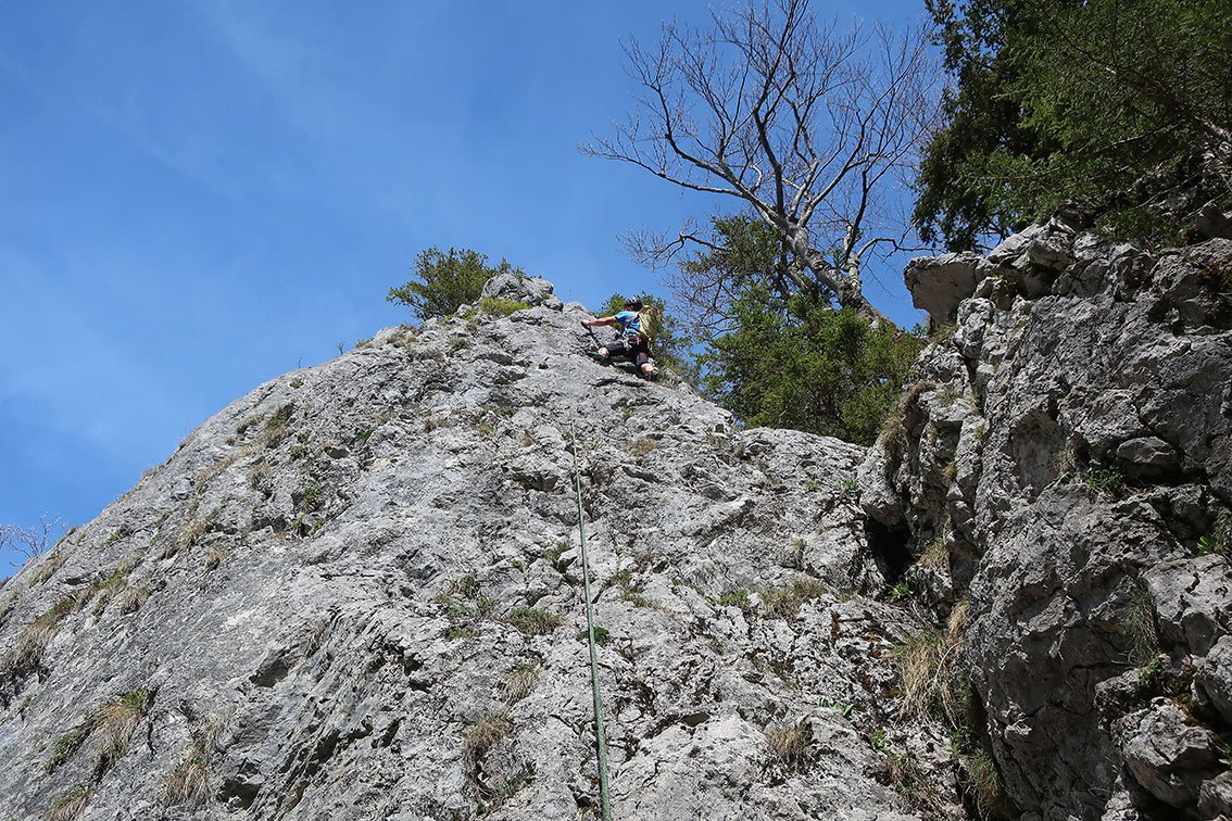 1. SL: In der markanten Rinne aufwärts zu Absatz, dann aber gleich links über gestuften Fels zum Bohrhaken und gerade aufwärts, steile hinauf zu einem Absatz (etwas links der Bäume ein Standplatz mit Kette).