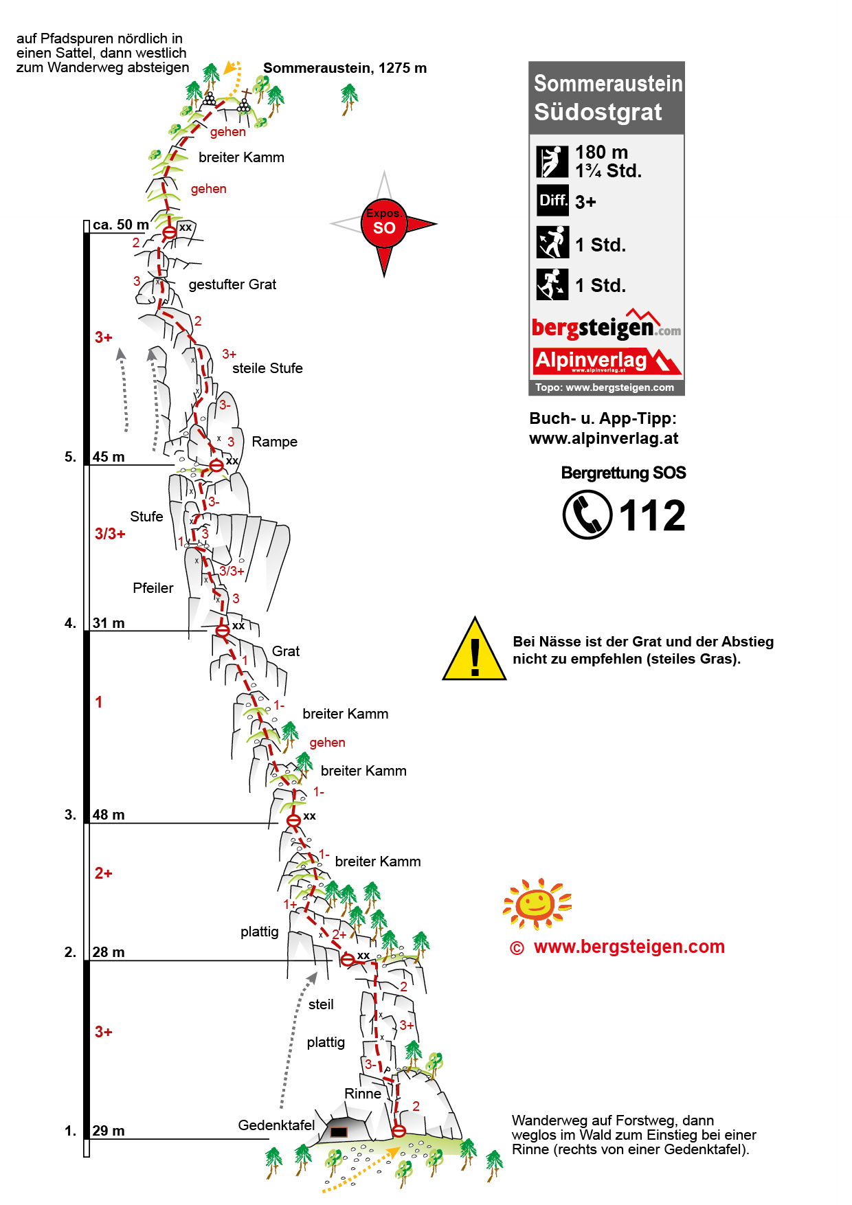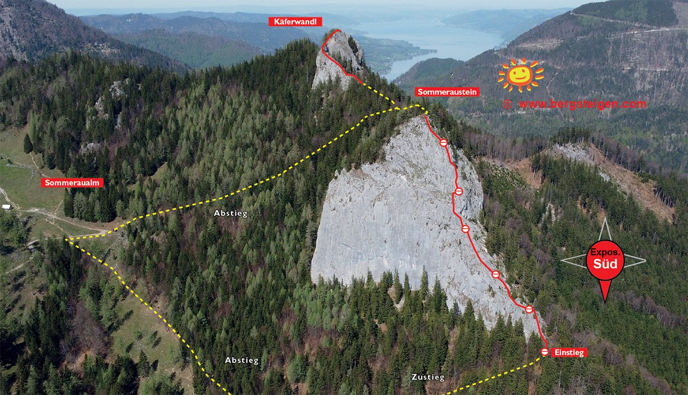 Der Südostgrat auf den Sommeraustein ist ein leichter, recht gut mit Bohrhaken abgesicherte Gratanstieg mit perfektem Blick auf den Wolfgangsee. Natürlich kann sich dieser Einsteiger-Grat nicht mit den hohen Wänden der Alpen messen, für den alpinen Neuling oder Liebhaber weniger stark besuchter Routen durchaus ein lohnendes Ziel. Wegen der kurzen Gesamtdauer und der Nähe zum See auch ideal mit einem Badetag zu kombinieren. Fast vom gesamten Grat hat man einen schönen Ausblick auf den Wolfgangsee und die umliegenden Berge - genau das hat seinen Reiz!