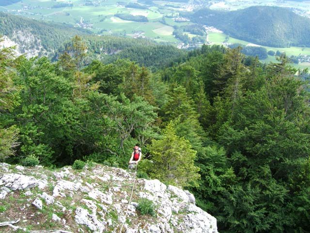 2. SL: Link zu Bohrhaken, dann um die Bäume herum über leichtes Gelände zu Stand an Kette.