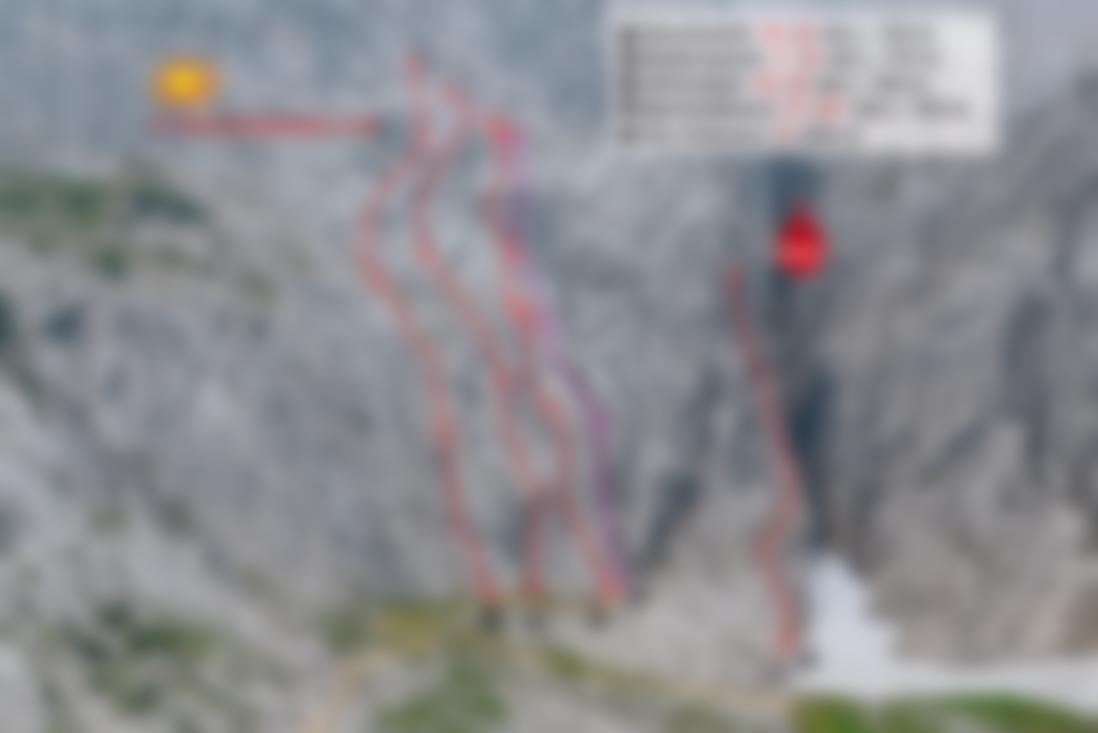In der Schlüsselseillänge muss man etwas im Wasserstreifen hinauf, dann rechts zu einem Graspolster (dort ist ein alter fixer Klemmkeil), danach kommt die glatte Schlüsselstelle bei zwei Bohrhaken.