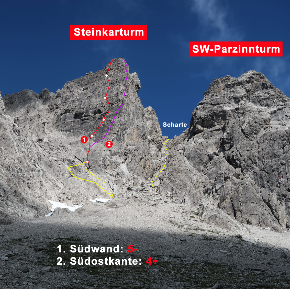 Alternativ kann man auch die Südostkante (rechts der Südwand, siehe Topo) klettern, diese Tour ist zwar leichter aber nicht so gut abgesichert wie die Südwand.