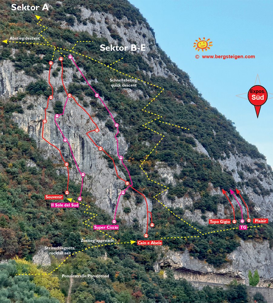 Sehr gut abgesicherte Plaisir-Route, welche im Bereich der beliebten Kain und Abel Tour verläuft und diese im unteren Teil kreuzt. Geringe Schwierigkeit, schöne, abwechslungsreiche Kletterpassagen und vor allem die sehr gute Absicherung machen die Route zum Publikumsmagneten. Sehr schöne Route, die man gut mit den anderen Mehrseillängen-Routen an den Ledro-Felsen verbinden kann.