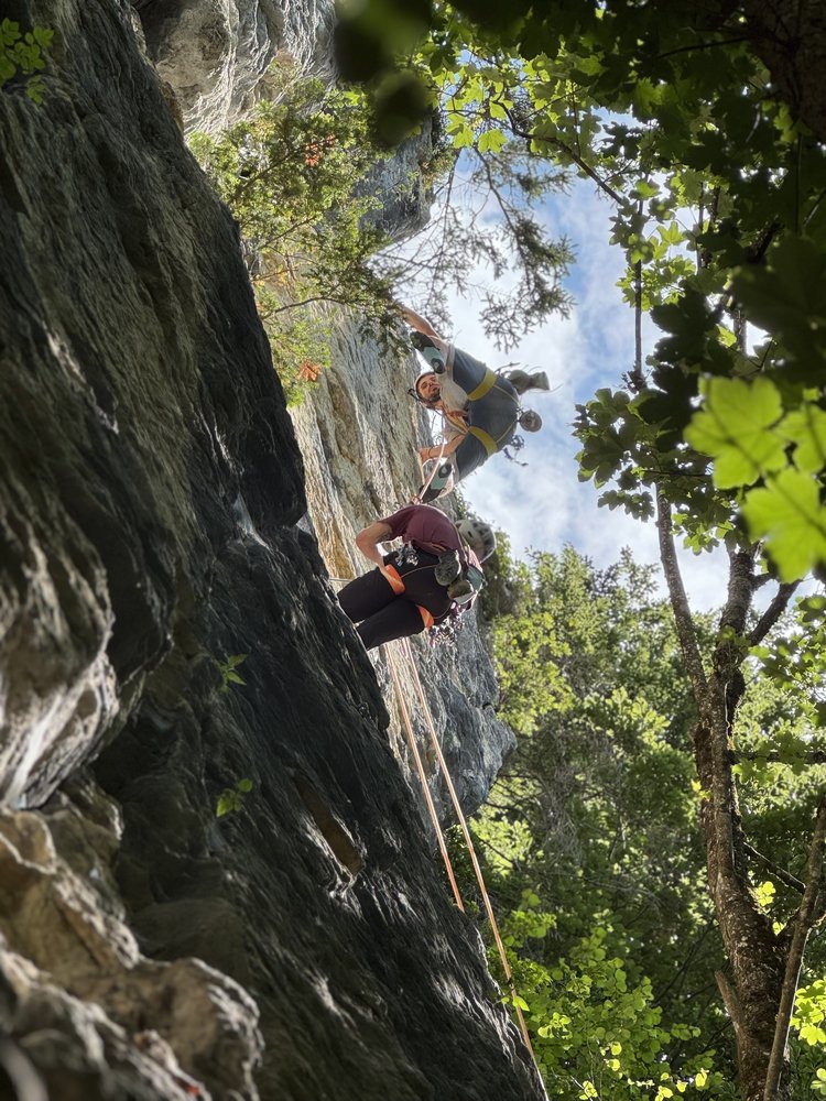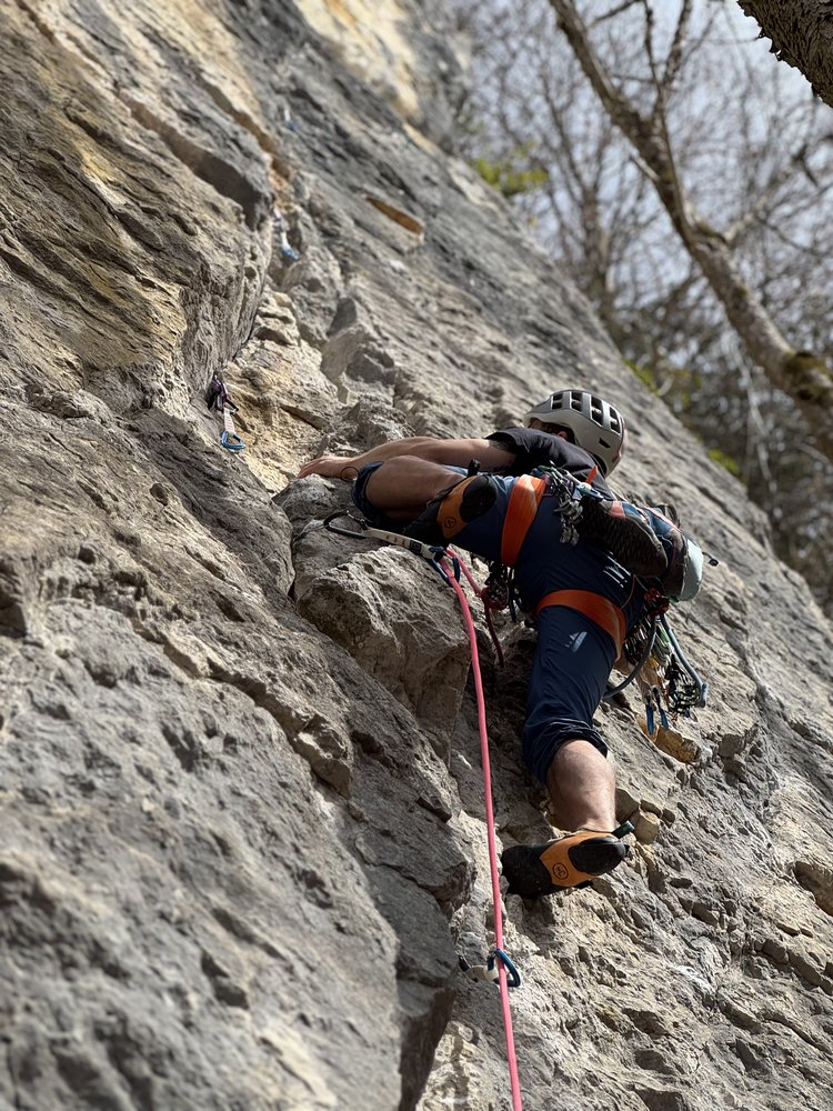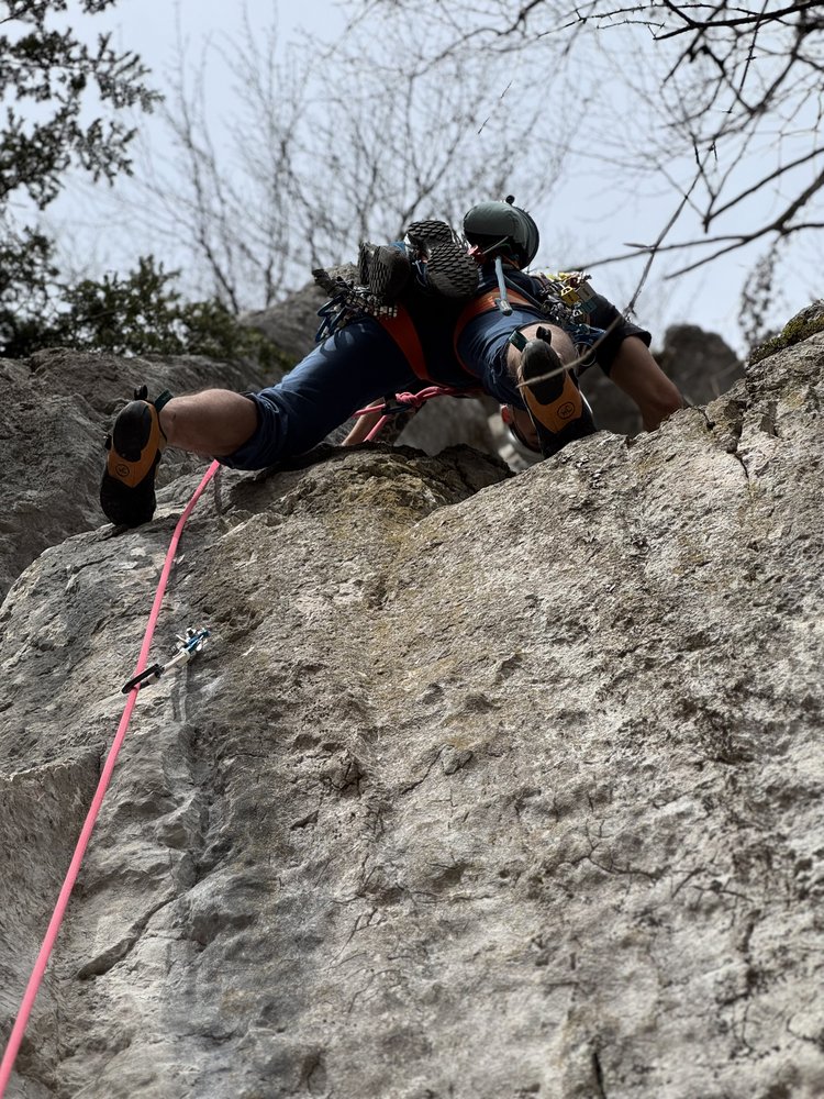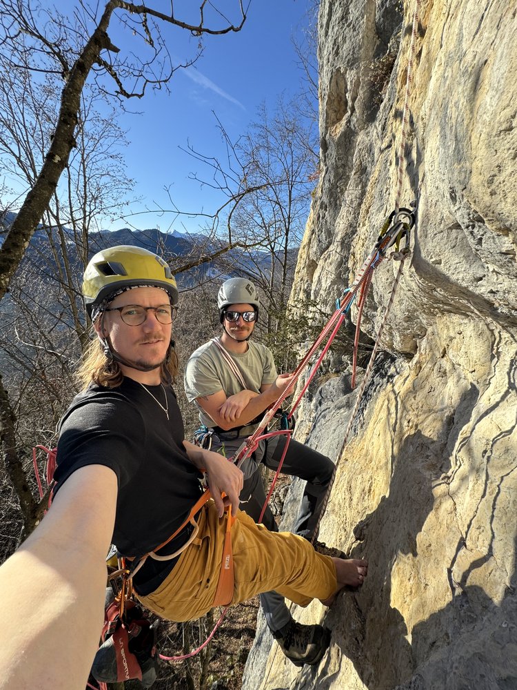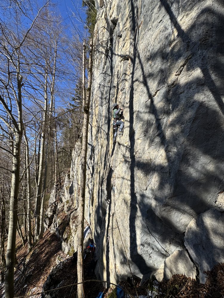 Ein geübter Umgang mit mobilen Sicherungsmitteln ist Voraussetzung! Der erste Bohrhaken steckt in 15 Metern Höhe.