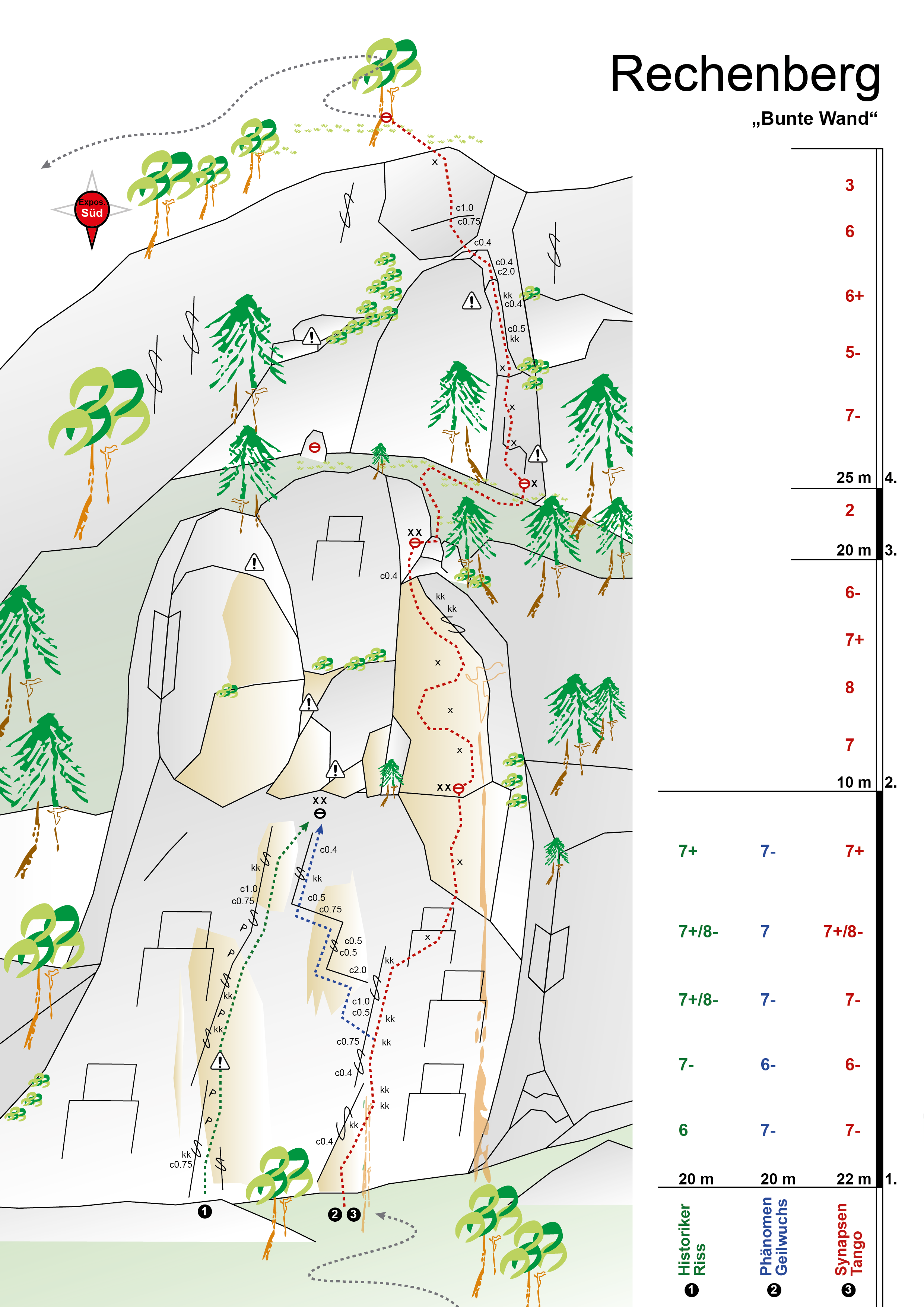 Nach einer 180-Grad Kurve (hier ist ein kleines Sportklettergebiet) auf dem Wanderweg gleich links parallel oberhalb der Forststraße weiter. Diesen Weg nach 200m verlassen und nach links bergauf in den Wald, bis man nach etwa 150m durch verblocktes Wald-Gelände die "Bunte Wand" errreicht.