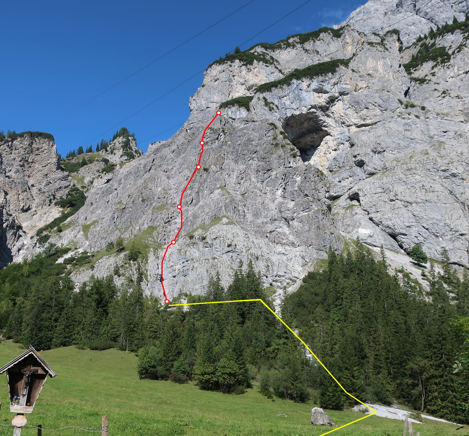 Von der Gramaialm nach den Häusern rechts über eine Wiese auf eine kleine Schuttrinne zu. In der Rinne aufwärts und am Wandfuß nach links zum Einstieg bei einer ausgewaschenen Rinne (roter Punkt, blasse Einstiegsaufschrift).