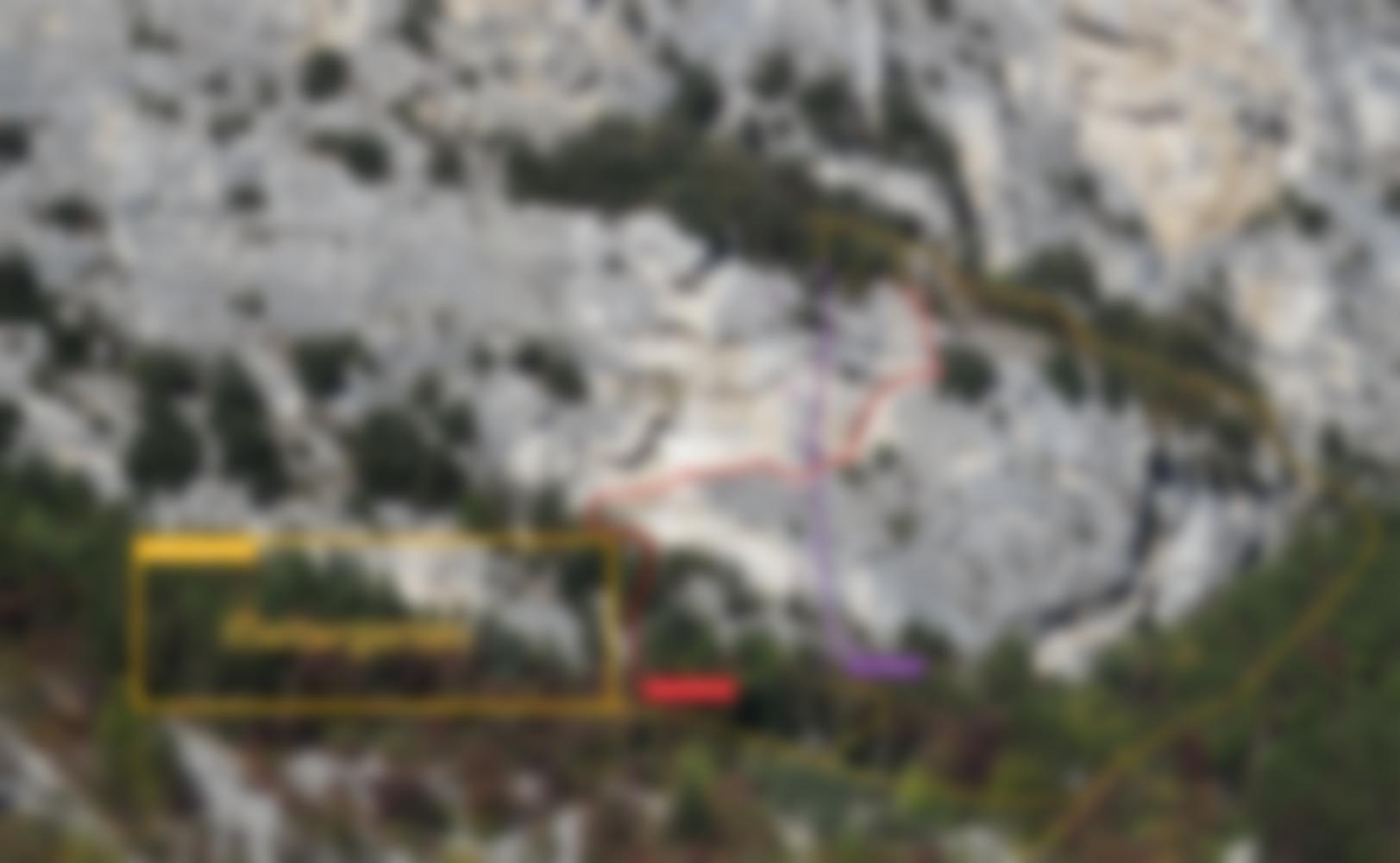 Vom Parkplatz auf der Straße Richtung Bauernhof „Maso Lizzone“ und davor links abzweigen (Wegweiser Wanderweg Nr. 428 „Sentiero degli Scaloni). Dem markierten Weg bis unter die Wand folgen und auf gutem Pfad am Wandfuss nach links zum Klettergarten abzweigen. Der Einstieg ist bei rechtester Tour (rote Schrift).