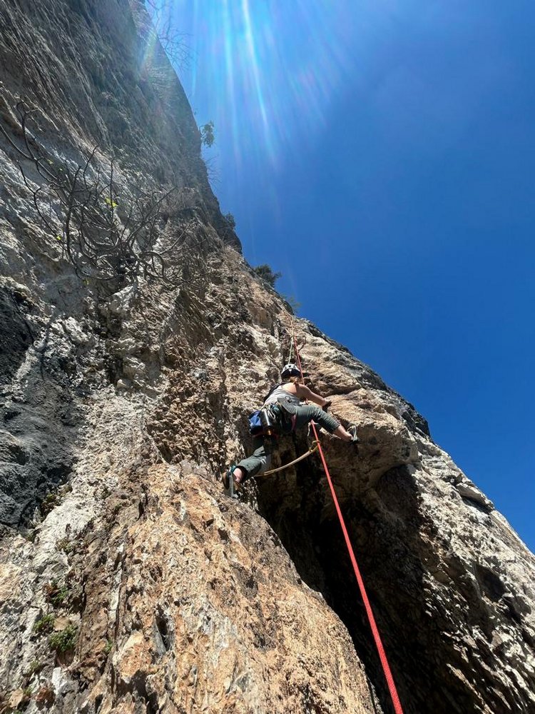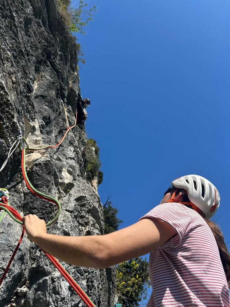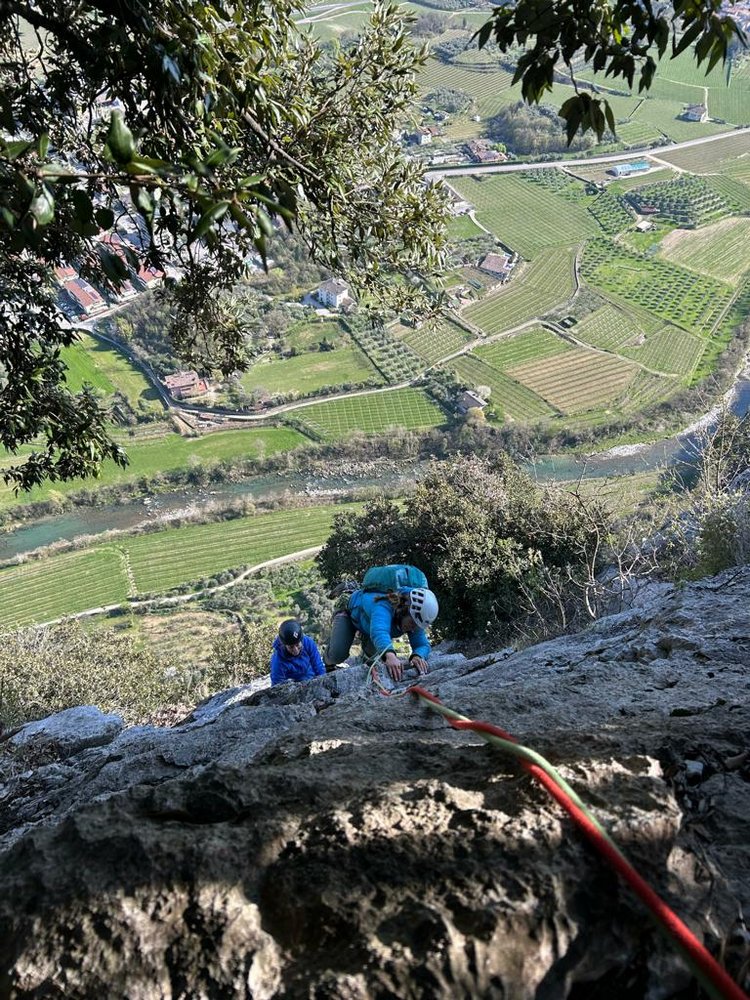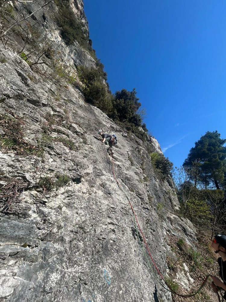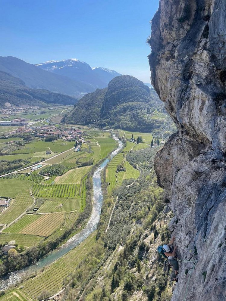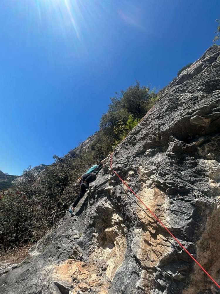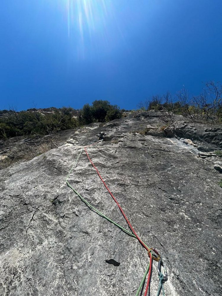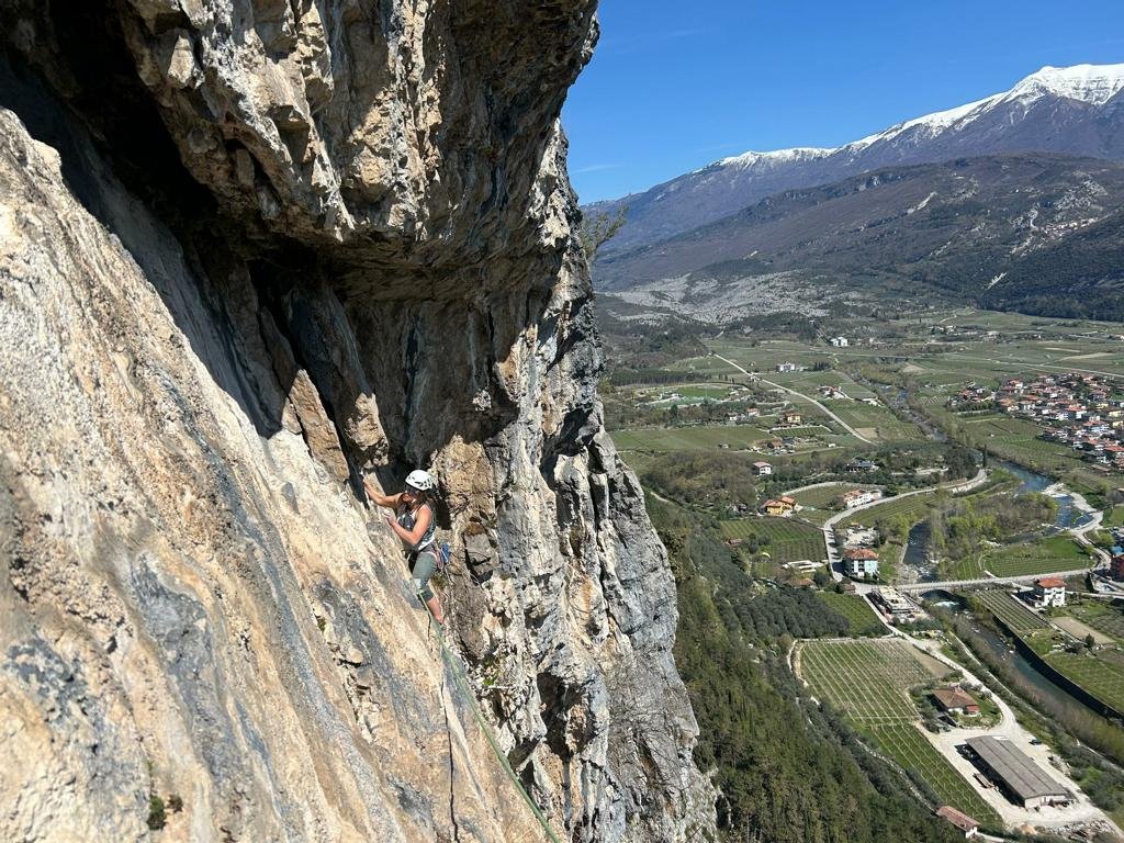 Die Route Essusiai ist eine schöne, abwechslungsreiche Route neben dem Megaklassiker "Archangelo". Die Tour wird nach oben hin immer besser. Schwierige Stellen sind gut abgesichert. In den Rissen, Verschneidungen und leichten Seillängen ist Eigeninitiative bei der Absicherung gefragt, bzw. muss man in den Plattenstellen schon mal ein bisschen über den letzten Haken rausklettern. Das Highlight der Tour ist auf jeden Fall der Mega Überhang in der 2. Schlüsselseillänge. Dort muss man sich nach Plattentraversieren über einen riesigen Bauch hieven. Die letzten beiden Längen können auch in der Via Archai fertiggeklettert werden (laut Arco Hohe-Wände-Führer schöner). Wir fanden die vorletzte Länge aber noch sehr lohnend! Zuerst ein kurzer Kamin und dann eine grandiose Piazschuppe!