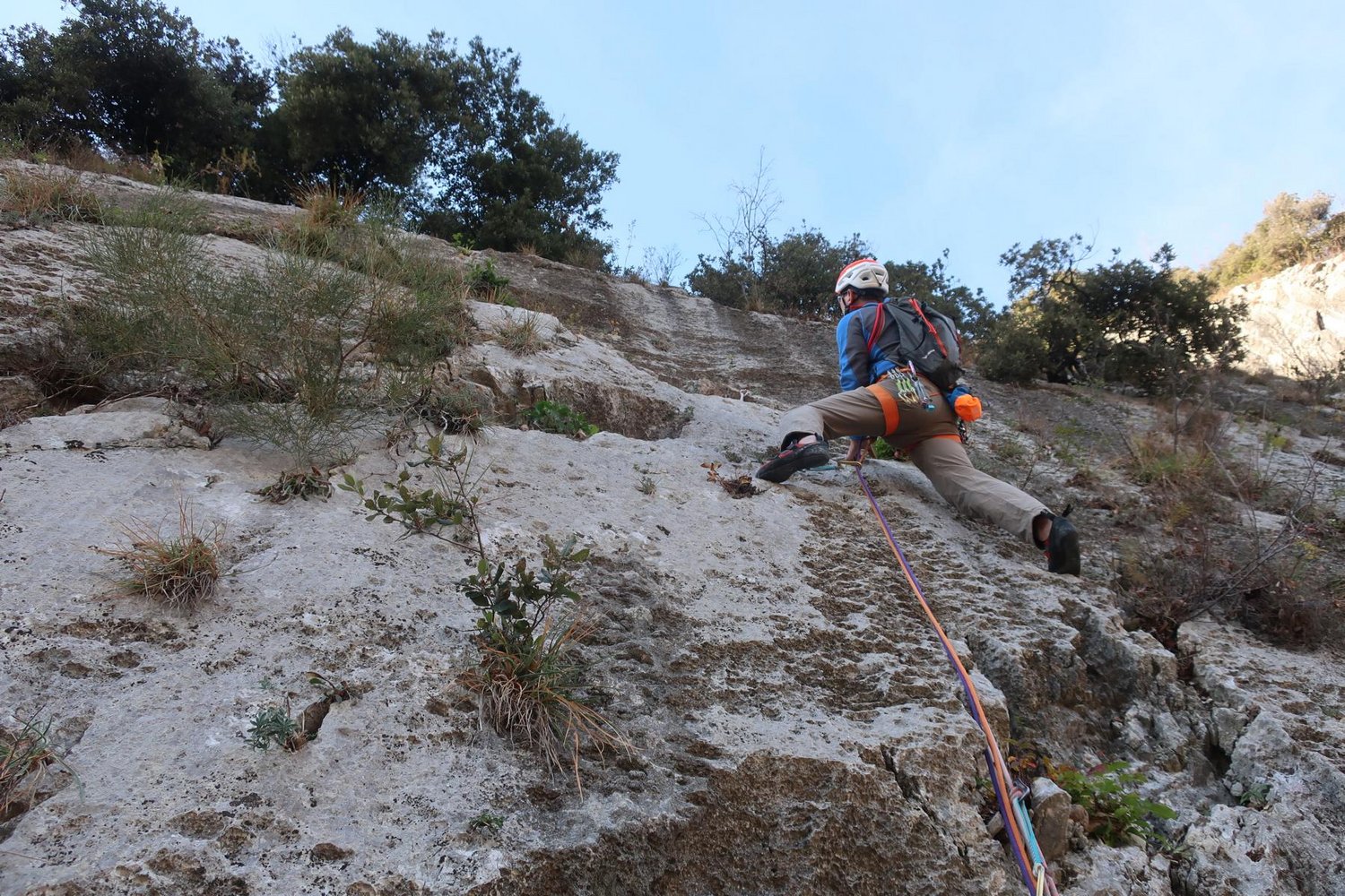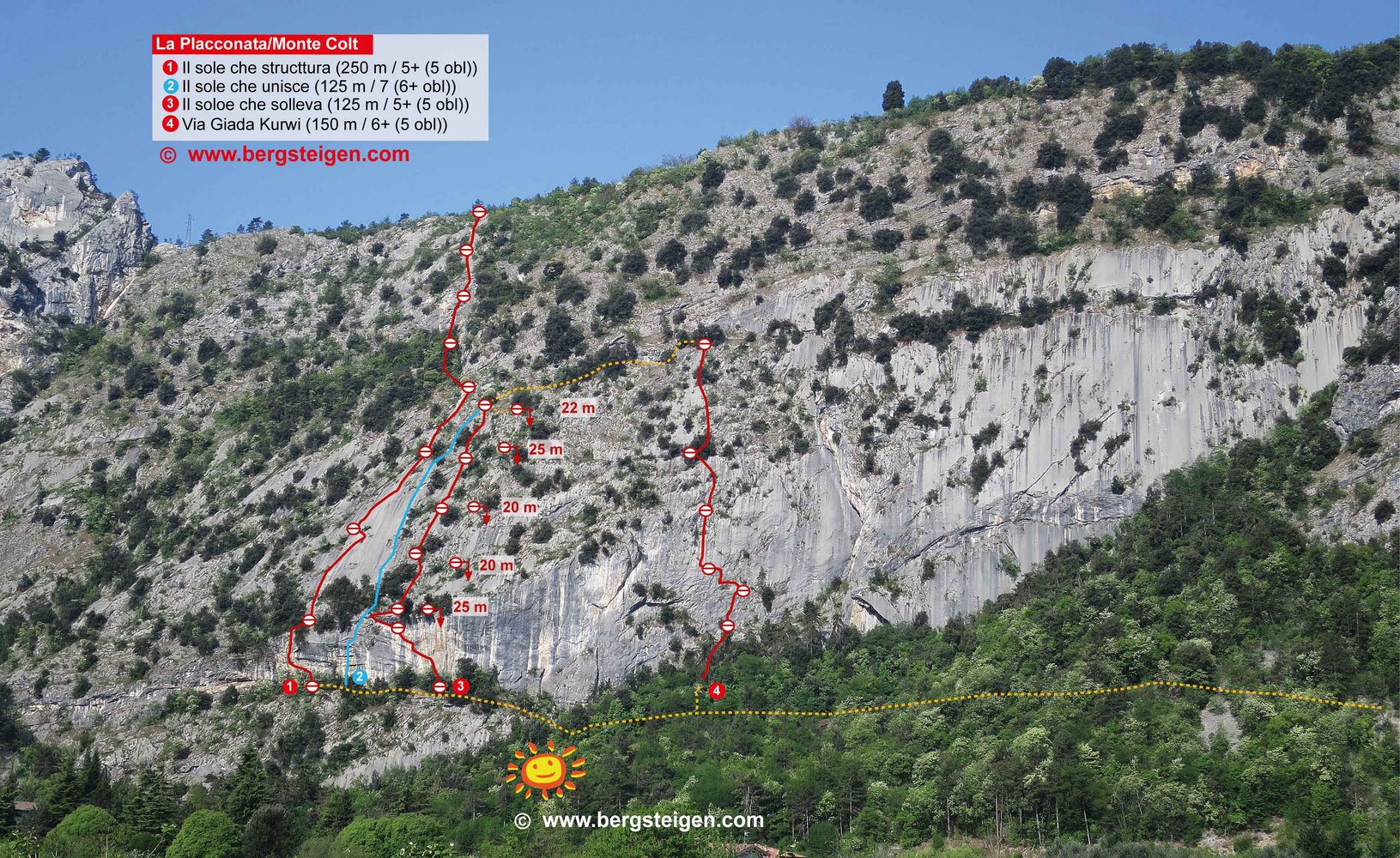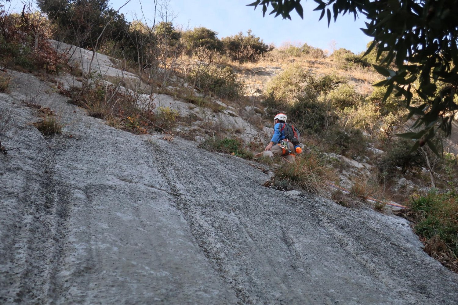 Die Via Giada Kurwi verläuft links der großen Verschleierung an den Placconata Platten nach oben. Und bietet schöne, aber im leichten Gelände auch etwas erdige und derzeit (Dezember 2025) noch etwas brüchige Kletterei. Wegen der recht guten Absicherung, den kurzen, nicht allzu anspruchsvollen Seillängen erfreut sich diese Route großer Beliebtheit.