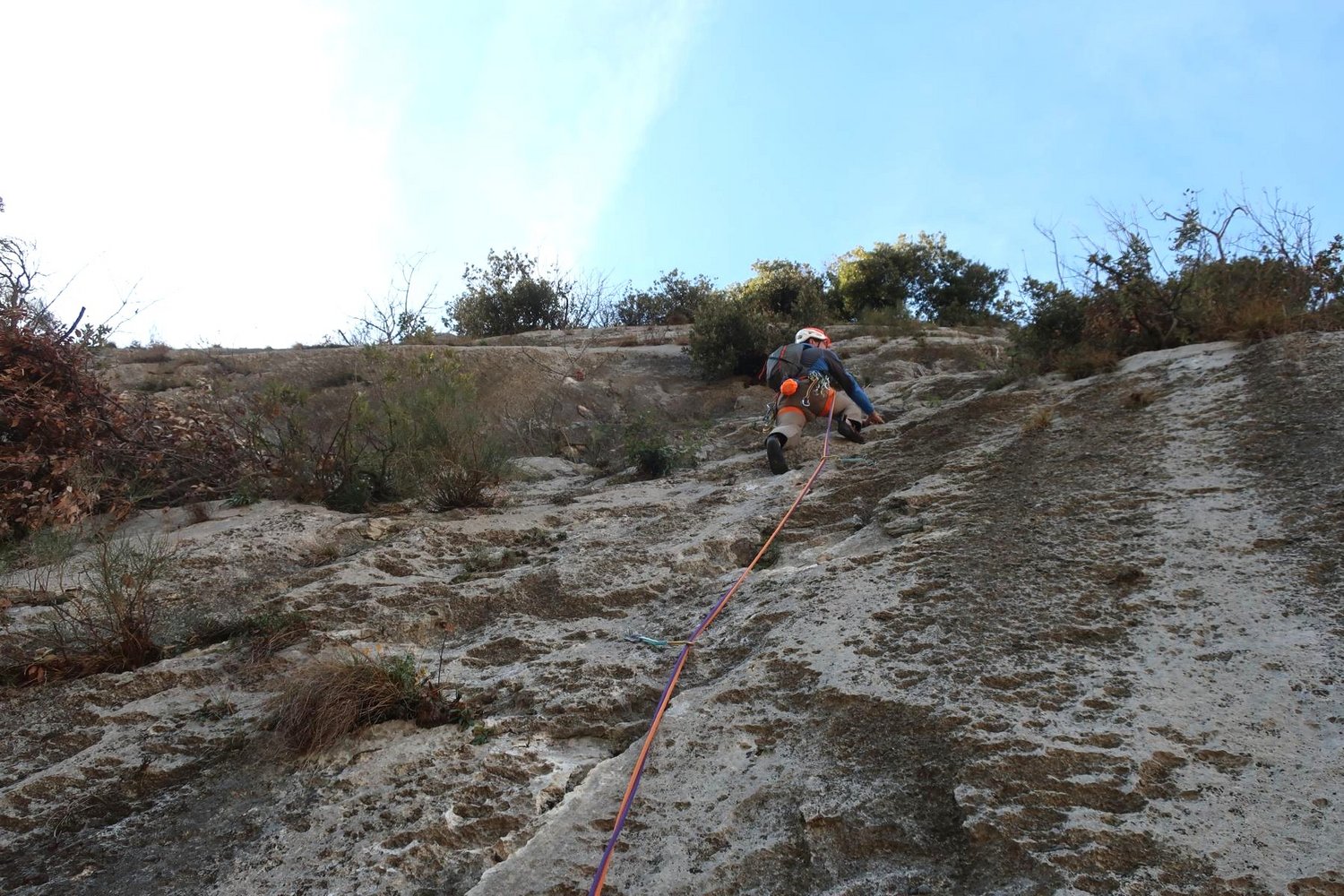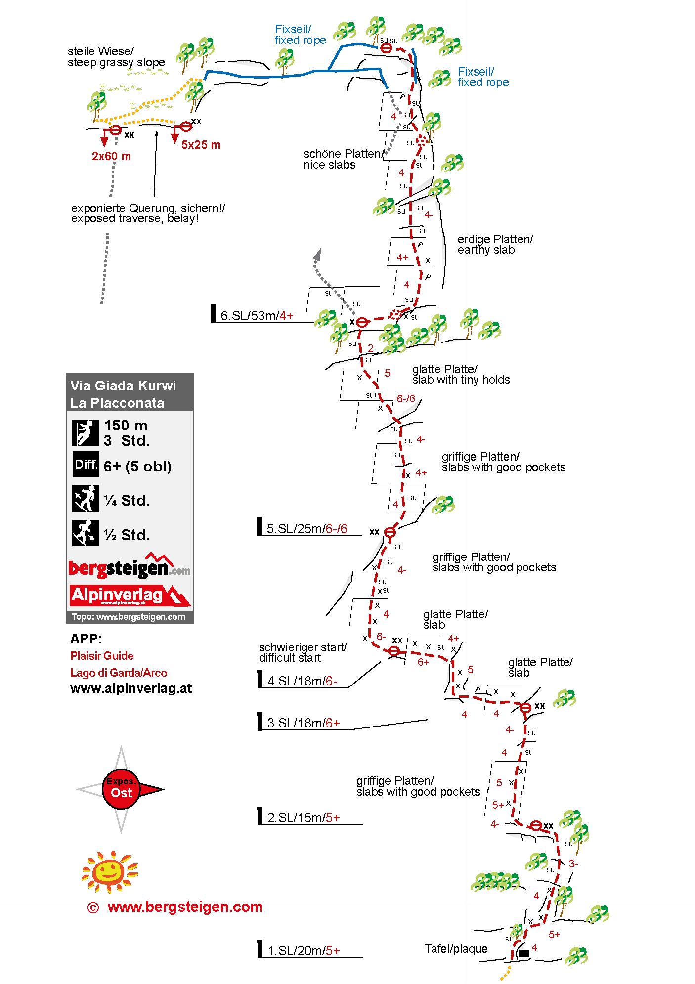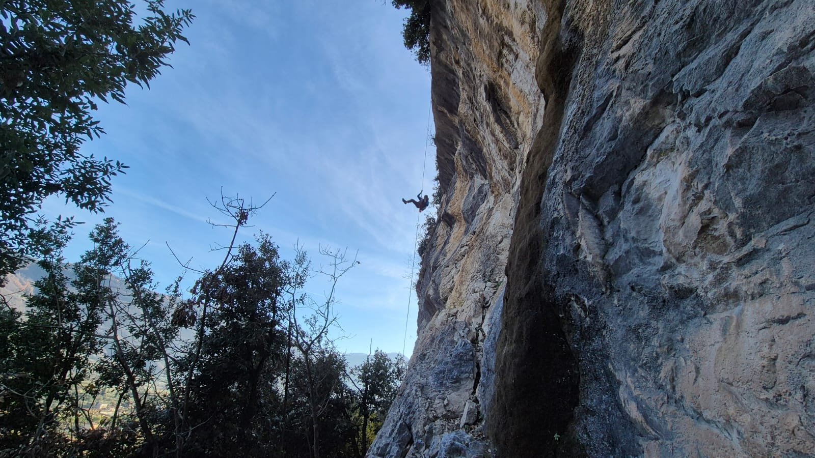 Die Via Giada Kurwi verläuft links der großen Verschleierung an den Placconata Platten nach oben. Und bietet schöne, aber im leichten Gelände auch etwas erdige und derzeit (Dezember 2025) noch etwas brüchige Kletterei. Wegen der recht guten Absicherung, den kurzen, nicht allzu anspruchsvollen Seillängen erfreut sich diese Route großer Beliebtheit.