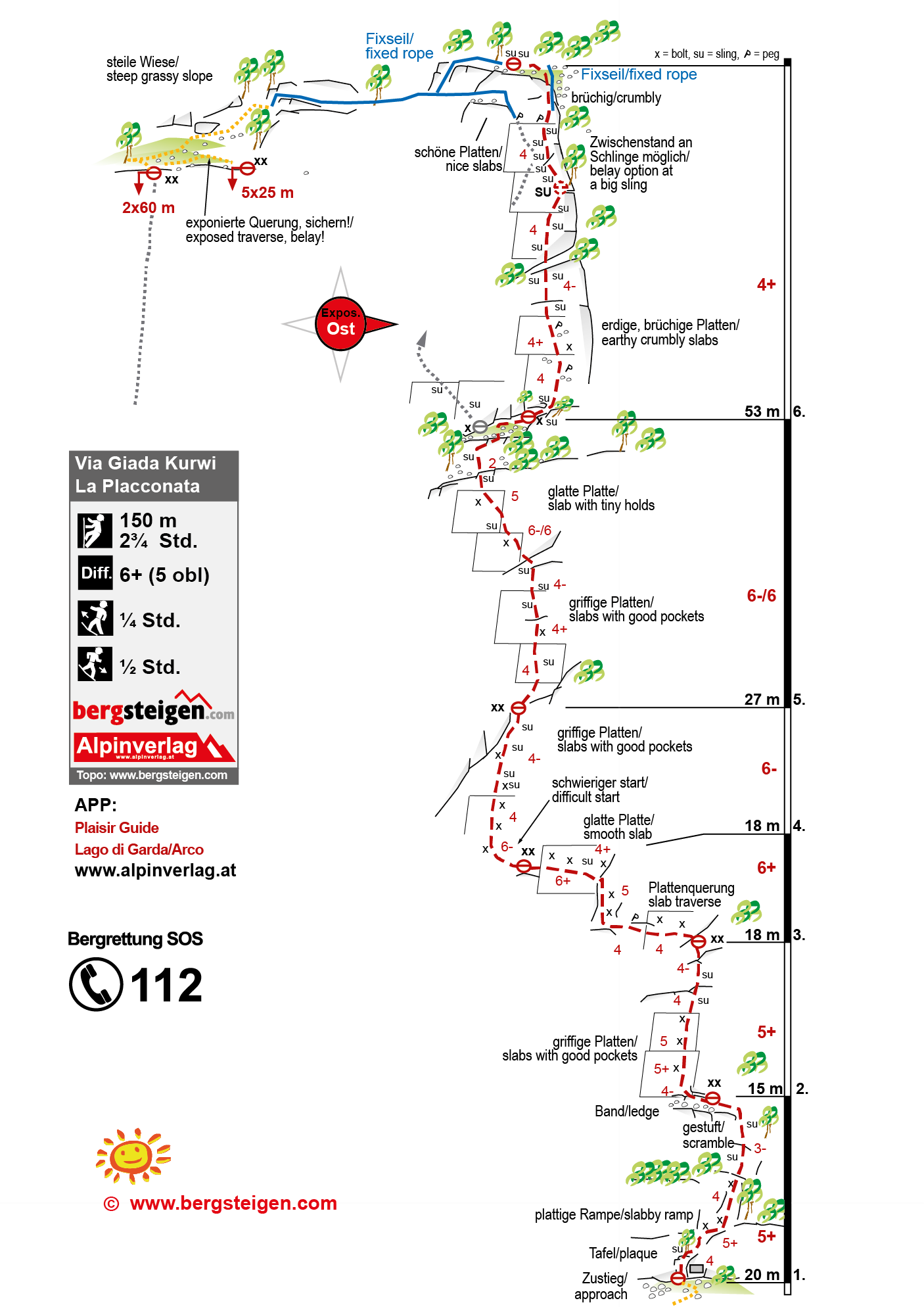 Die Via Giada Kurwi verläuft links der markanten Verschneidung an den Placconata Platten im Zickzack nach oben. Und bietet schöne, aber im leichten Gelände auch etwas gestufte und erdige Kletterei. Großteils schöne Kletterpassagen machen diesen Anstieg zum schönen Halbtages-Kletterabenteuer. Wegen der recht guten Absicherung und den kurzen, nicht allzu anspruchsvollen Seillängen erfreut sich diese Route großer Beliebtheit.