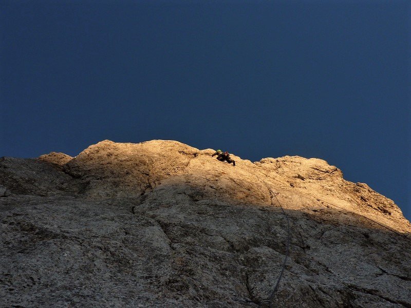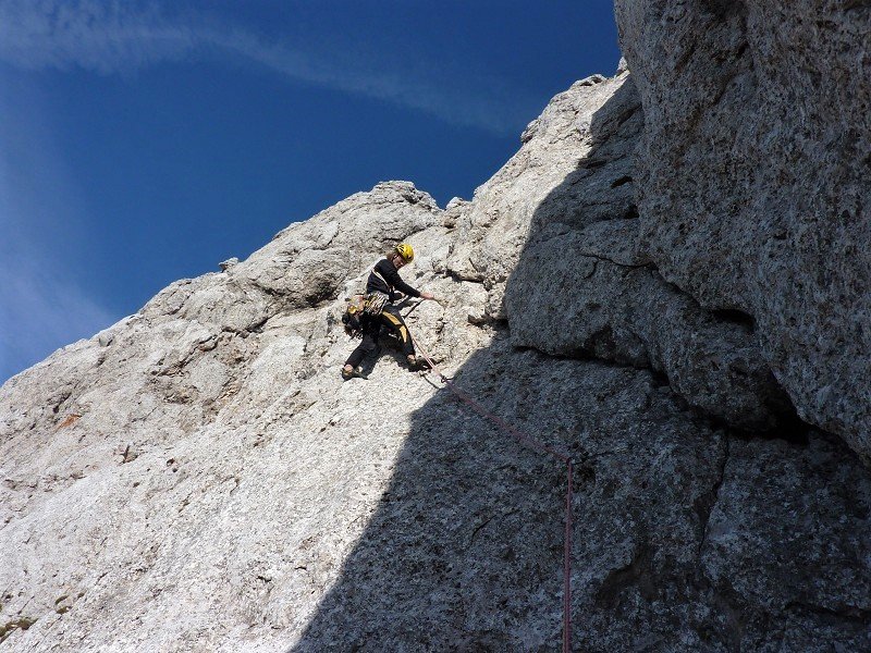 Wer die zwei ersten etwas ranzigen Zustiegsseillängen hinter sich gebracht hat, kann sich dann auf sehr schöne Seillängen in plattigem Fels (durchsetzt mit Rissen) freuen.