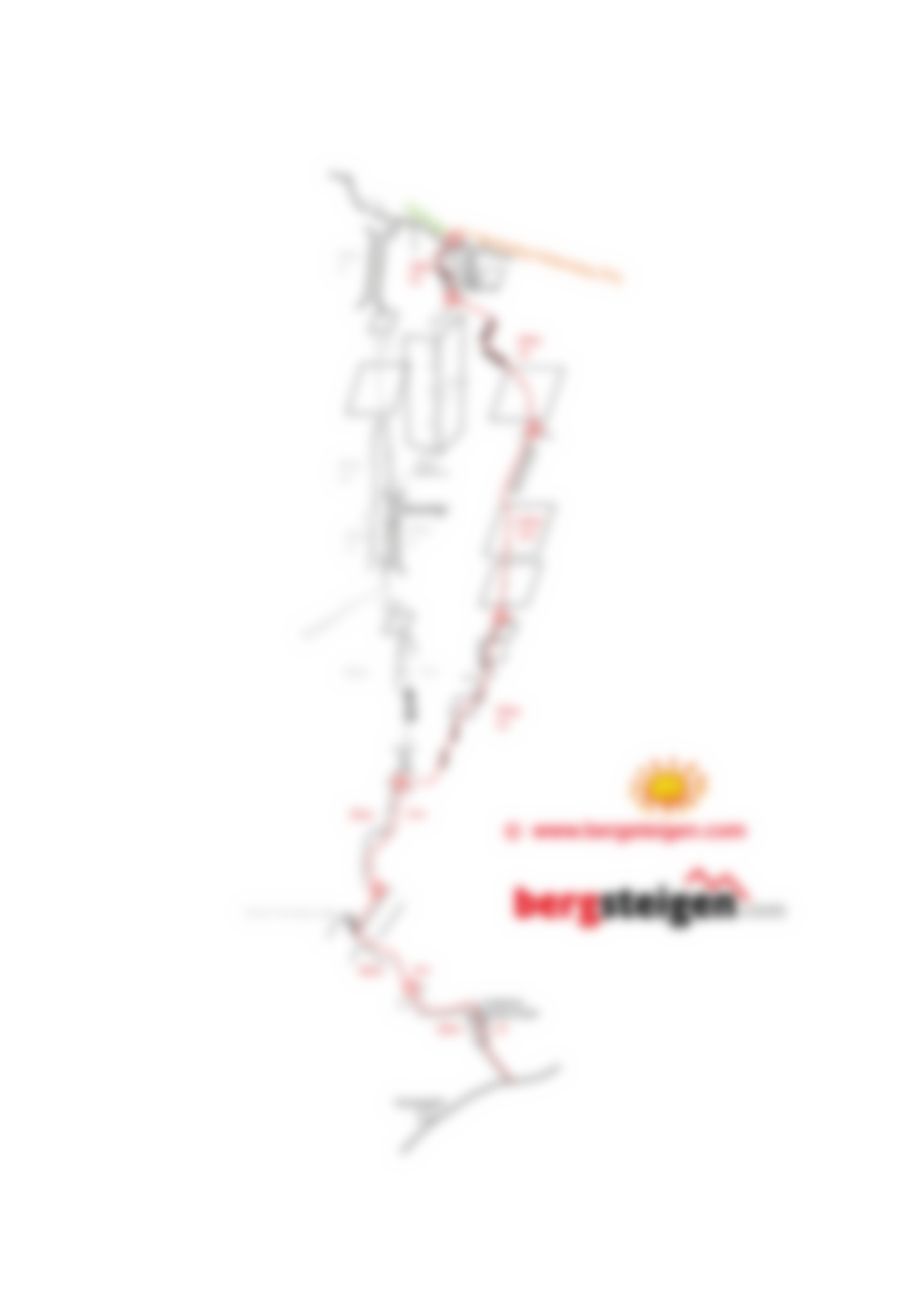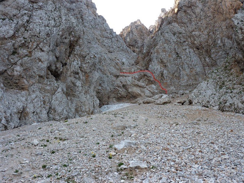 Vom Koschutahaus folgt man dem markierten Wanderweg nach Südosten Richtung Koschutnikturm. Nach etwa 50 min erreicht man ein Schotterfeld mit einem Wegweiser. 20m hinter dem Wegweiser zweigt ein Steig nach oben ab (roter Pfeil auf Stein und Beschriftung “ÖTK”). Diesen Steig das Schotterfeld hinauf bis zu einer weiteren Markierung “ÖTK” auf einem Stein. Von hier das Schotterfeld nach links über einen kleinen Pfad bis zum Wandfuß queren. Von hier steigt man den Wandfuß rechts entlang noch etwa 50Hm höher bis zu einer Schrofenrampe. Diese 20Hm hinauf bis zu einem 15m langen Fixseil (von unten sichtbar). Dieses hinauf und dann 20m nach links über abschüssiges Band zum Einstiegsbohrhaken (II).