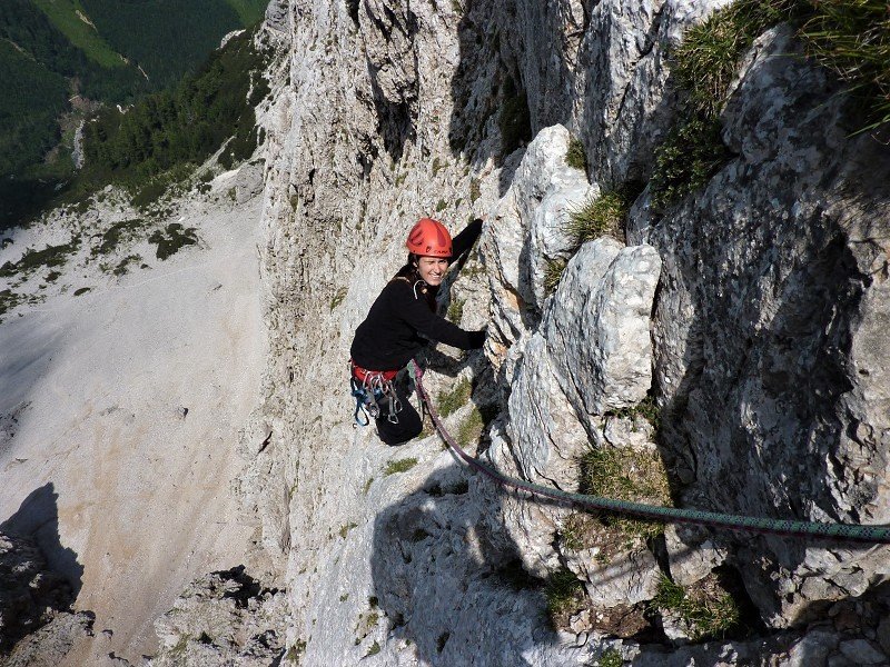 Die Route ist semialpin eingerichtet, d.h. es gibt einige Bohrhaken, die allerdings mit mobilen Sicherungsmitteln ergänzt werden wollen. Vielleicht ist die Tour sogar die bekannteste der mittelschweren Touren am Koschutnikturm.
