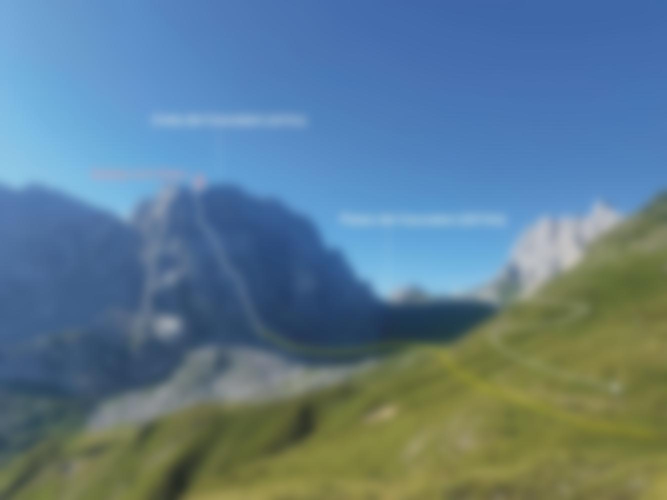 Vom Bohrhaken auf der Südseite des Grats seilt man sich einmal 30 Meter ab. Nun gerade über das teils schottrige, teils grasige Schrofengelände absteigen (teils Steinmänner). Wenn das Gelände breiter wird, quert man leicht fallend nach rechts Richtung Wand und gelangt so zum vom oben bereits sichtbaren Weg. Eine alternative, grasigere und steiler Variante umgeht die von oben nicht sichtbare (zentrale) Wand, die man umgehen muss, über links, wobei man aber nicht die markante Rinne nimmt, die man eventuell nehmen möchte. Man bleibt zunächst eher zentral, schlängelt sich um kleinere Platten hinunter und nimmt dann diese grasige Rinne, ehe man den Weg erreicht. Nun nach Westen in den Sattel, über den Schottersteig entlang der Enziantürme (I Campanile de Genziane) hinunter, bei der Weggabelung nach Nordwesten hinauf zum Passo dei Cacciatori (2213m, Reste von Stellungen des 1.WK). Nun den Weg, der den Kessel ausgeht Richtung Hochalpl nehmen, unterhalb des Passo di Sesis führt dann ein Weg (Beschriftung am Stein „Luggau“) Richtung Bladner Joch zurück. Von dort den bekannten Weg zurück zum Auto.