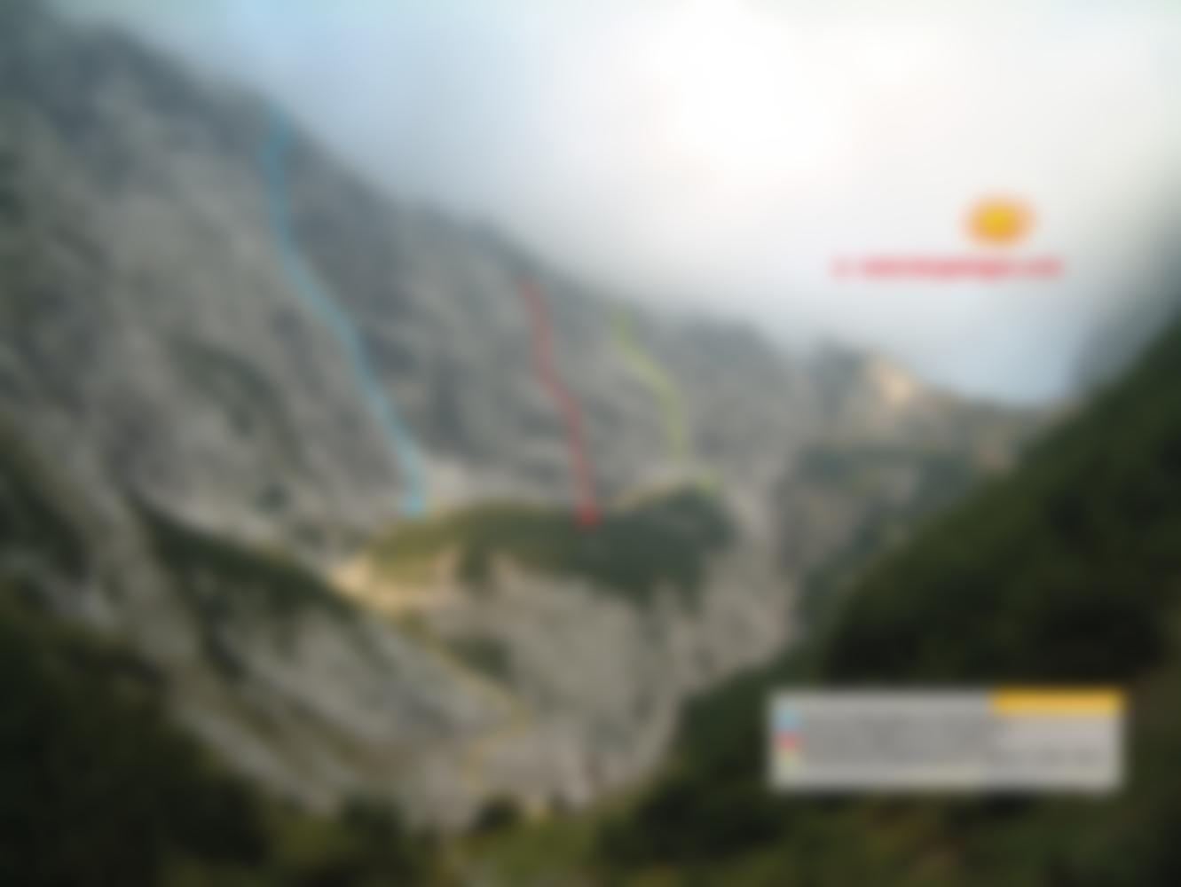 Dem Weg Richtung Bärenlahnersattel folgen, nach gut 5 min gelangt man in ein Bachbett. Hier verlässt man den Weg und geht am linken Rand des Bachbettes weiter. Bis man auf eine Wiese mit einem markanten Felsblock rechts vom Bach gelangt. Hier nach links und zur Wandstufe, durch die eine kleine Rinne/Klamm von links herunterzieht und das Bachbett mündet. Die Felsenstufen links der kleinen Rinne/Klamm sind der Aufstieg (kurz 1-), sie werden über ein "Querband" erreicht. Nun weiter aufwärts und bei guter Möglichkeit am Ende der Rinne/Klamm nach rechts unter die Hauptwände. Bei markanten Steinmann auf Anhöhe im rechten Winkel zur NO Wand gehen. 5 min vom Steinmann ( 75 cm groß ist der Steinmann) Einstieg an der VIVA LA VIDA Tafel.
