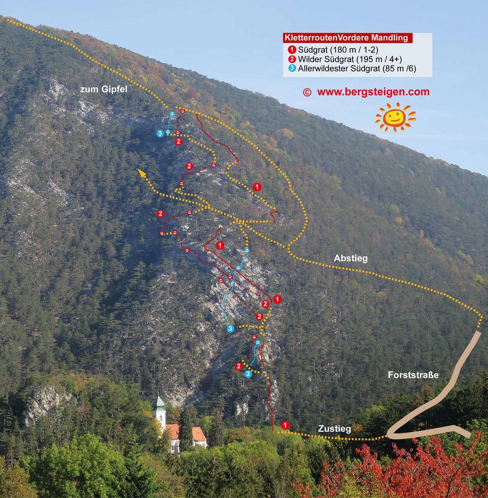 Wenn man vom Unterberg kommt fällt einem in Waldegg links ein markanter Felsrücken auf. Er zieht an der Südseite fast bis zur Straße hinunter. Bereits vor 100 Jahren wurde der Südgrat erklettert und vor einigen Jahren auch mit zarten roten Punkten markiert. Es ist eine, abgesehen von den ersten Metern im unteren 2ten Grad eine einfache Bergfahrt, die sich gut mit einer Wanderung zum Gipfel verbinden lässt.