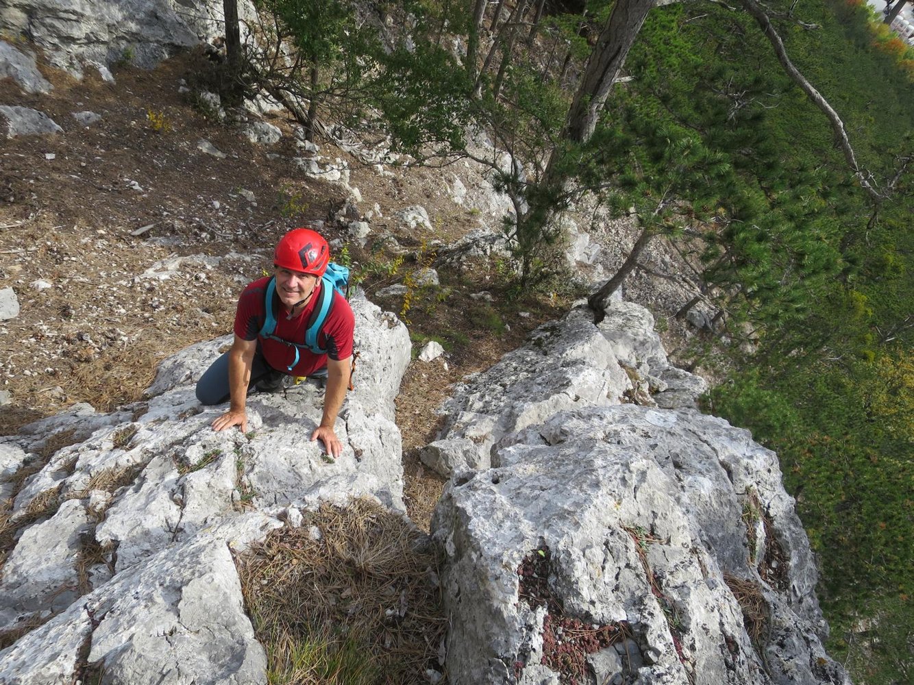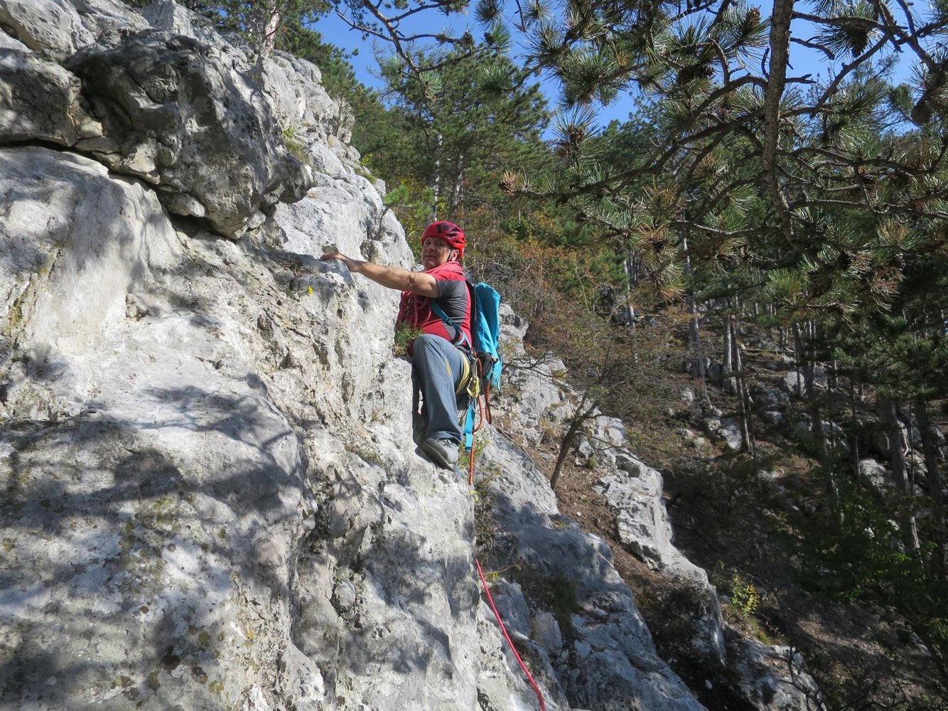 Die erste SL ist sehr gut gesichert, danach gibt es keine Sicherungen mehr. Wir mit Seil unterwegs ist, kann mit Schlingen an Bäumen sichern.