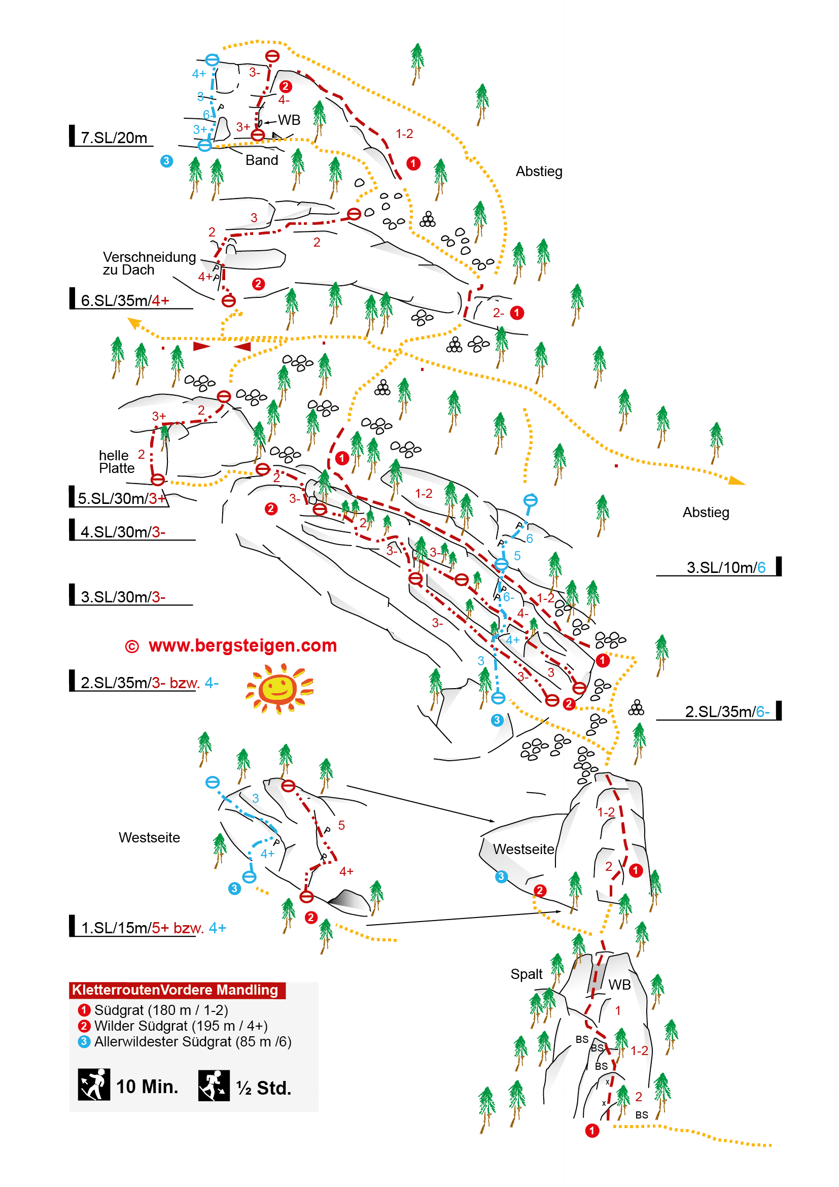 Vom Einstieg geht über eine Platte mit 2 Bolts kurz (2) aufwärts und nachher (1+) nach links auf einen Absatz. Von dort (1)hinauf zum markanten Spalt - dort befindet sich auch das Buch. Es folgt eine kurze Gestrecke am Grat, bevor sich dieser 2- wieder aufstellt. Am Endes dieses schönen Aufschwungs folgt man Steinmännern zur nächsten großen Wandzone. An ihrem rechten Ende geht der Südgrat am oberens Rand (1+) weiter bis er am Ende der felsten auf einen markierten Weg trifft. Es folgt ein nächster kurzer schöner Aufschwung (2-) - immer auf die roten Punkte und Steinmänner achten - bevor man zum letzten Grataufschwung kommt.